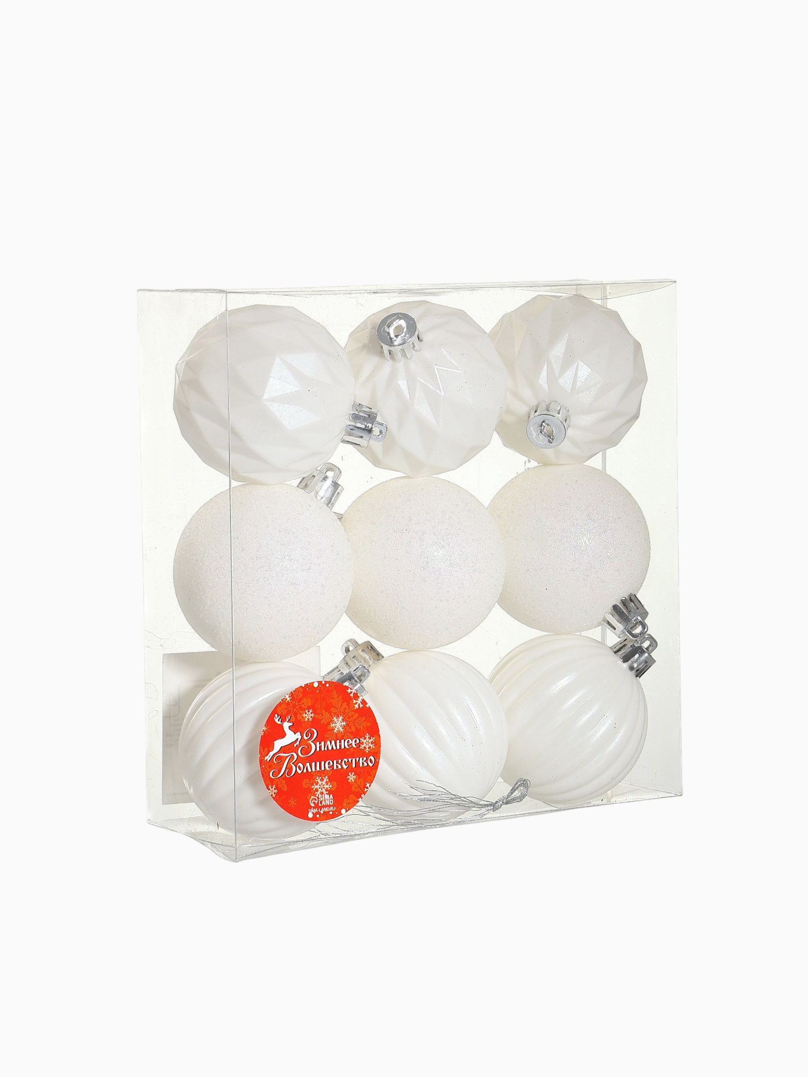Ёлочные игрушки "Перл", шары новогодние, пластик, набор d=6 см, 9 шт., грани, белый, 6x6 см., Зимнее волшебство, Китай