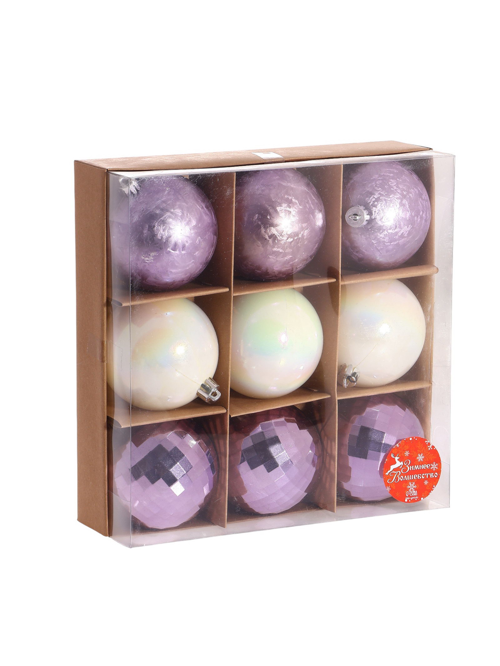 Ёлочные игрушки "Элит диско", шары новогодние, набор 9 шт., d=8 см, сиреневый/белый, 8x8 см., Зимнее волшебство, Китай