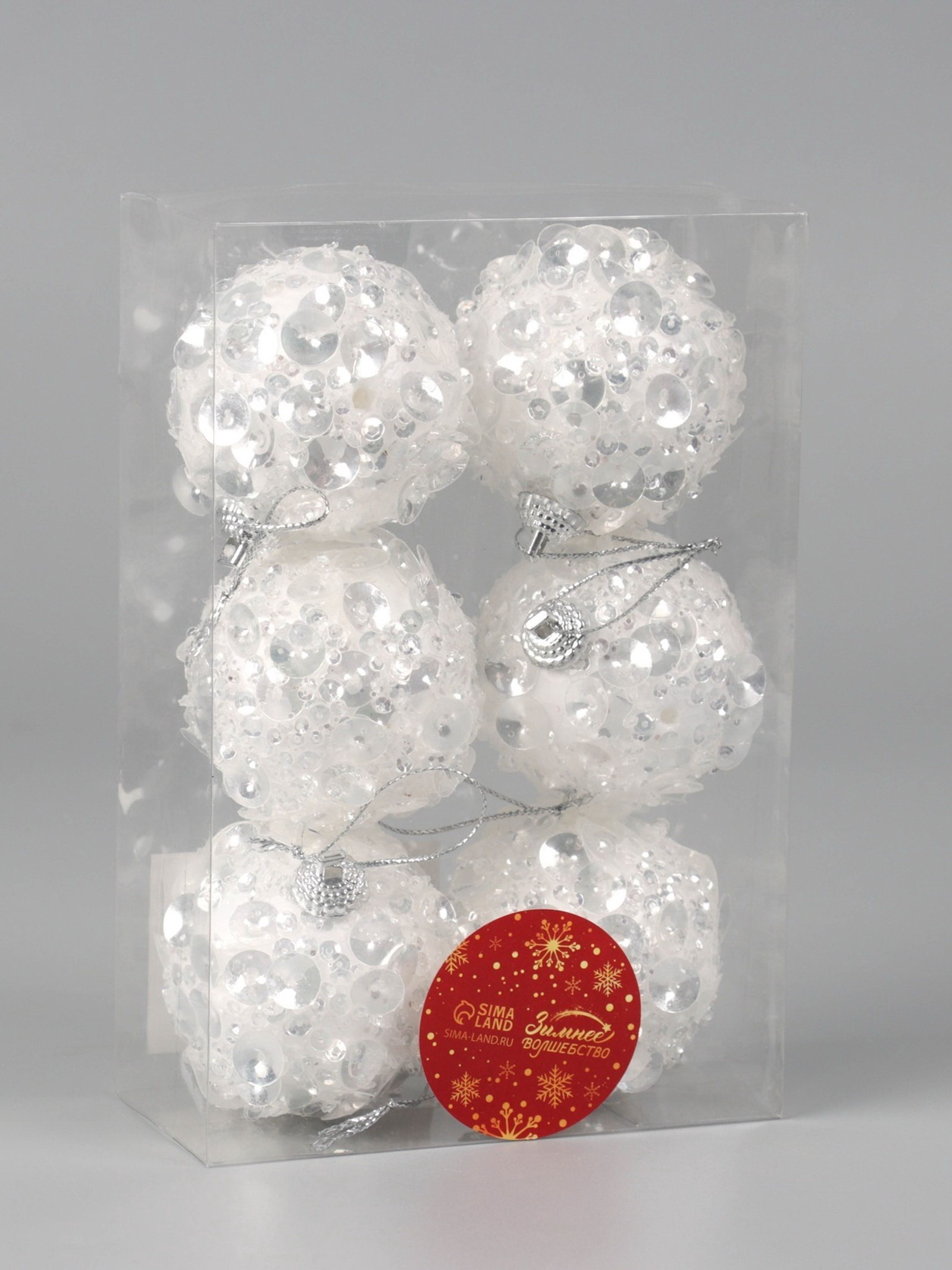 Ёлочные игрушки "Альваро", шары новогодние, d=6 см, набор 6 шт., пайетки, белый, 6x6 см., Зимнее волшебство, Китай