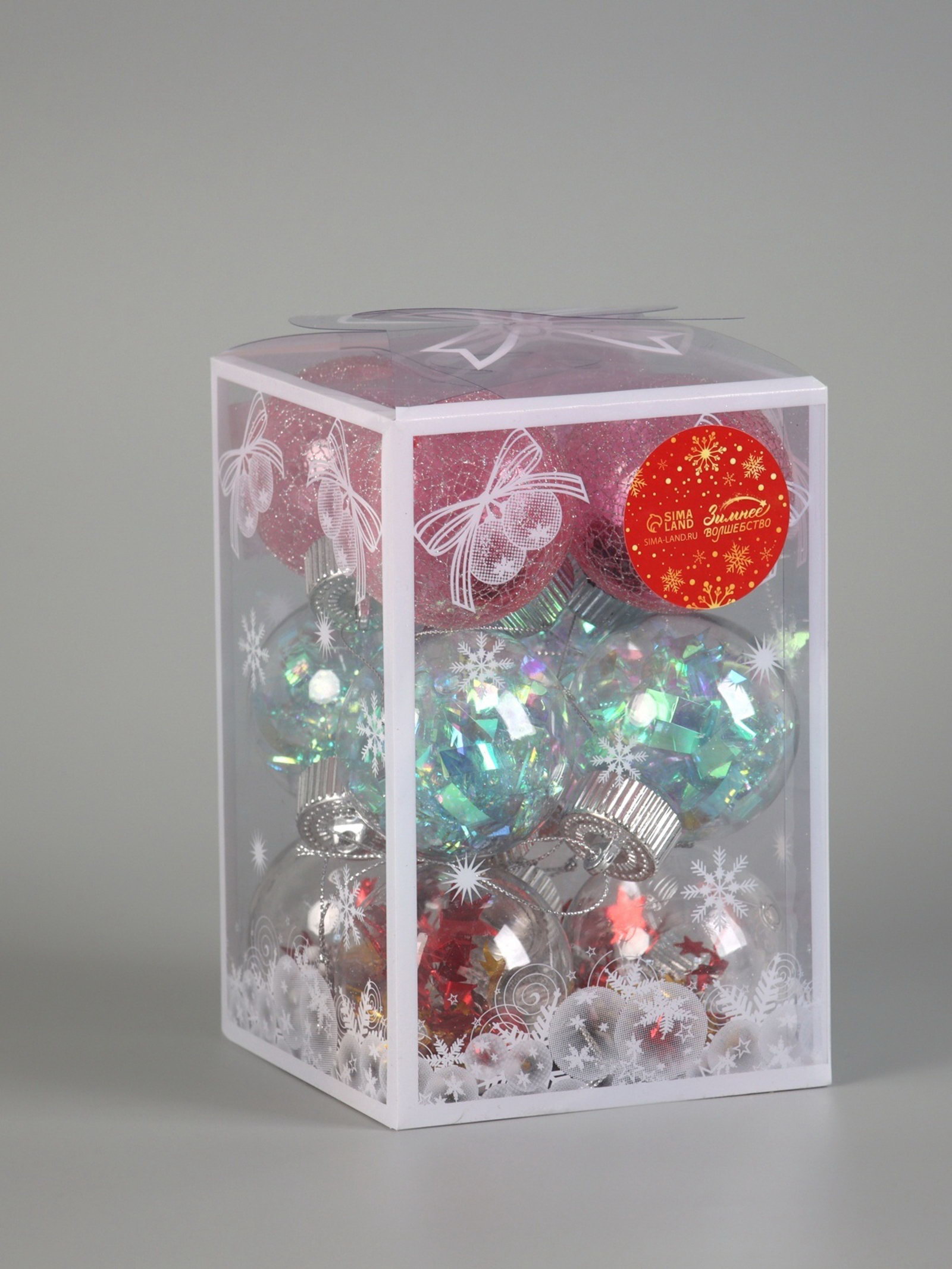 Цвет: МИКС, Прозрачный Особенности: Прозрачная, С наполнением Размер упаковки: 11.5 x 17 x 11.5 см. Диаметр шара, см: 6 В наборе, шт.: 12 Набор: Да Стиль: Шебби-шик Форма игрушки: Шар Тематика праздника: Новый год Символ года: Нет tnved: 9505109000 Рисунок: Да Набор из 12 прозрачных пластиковых шаров диаметром 6 см с текстурой в стиле шебби-шик добавит нежности и изящества в праздничное оформление ёлки. Разноцветные украшения с эффектом сеточки создают лёгкую игру света и объёма, подчёркивая атмосферу Нового года. Особенности