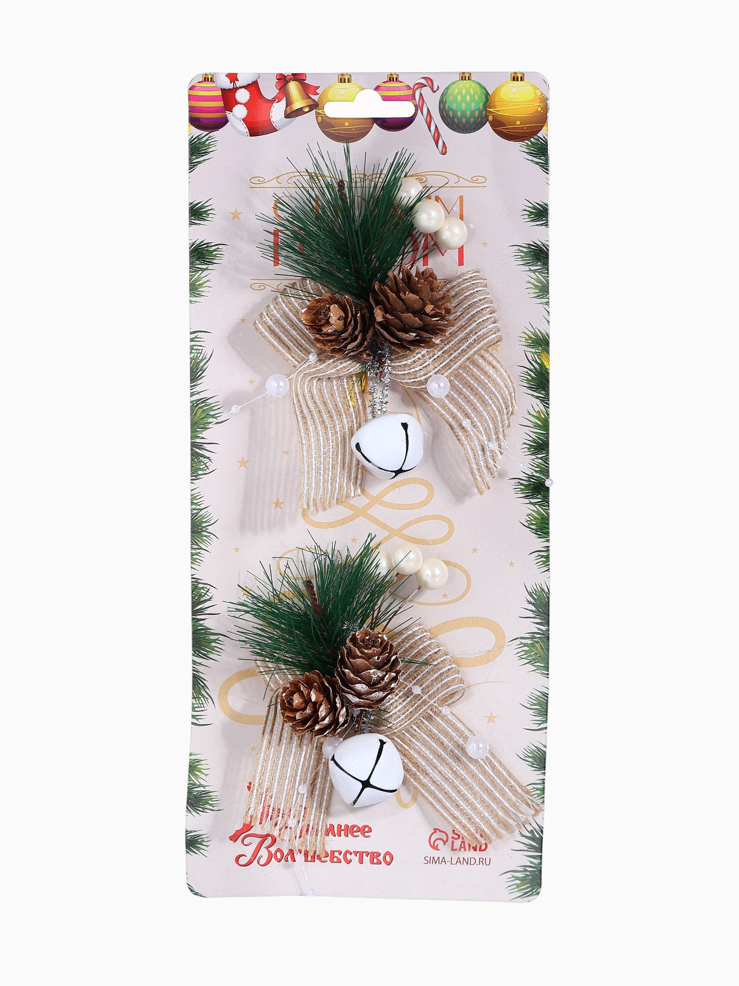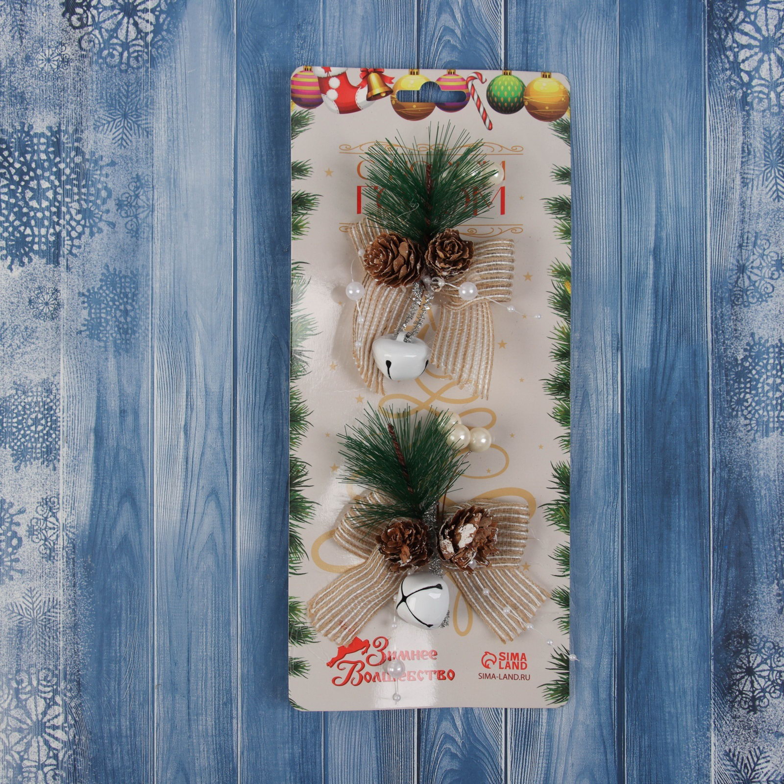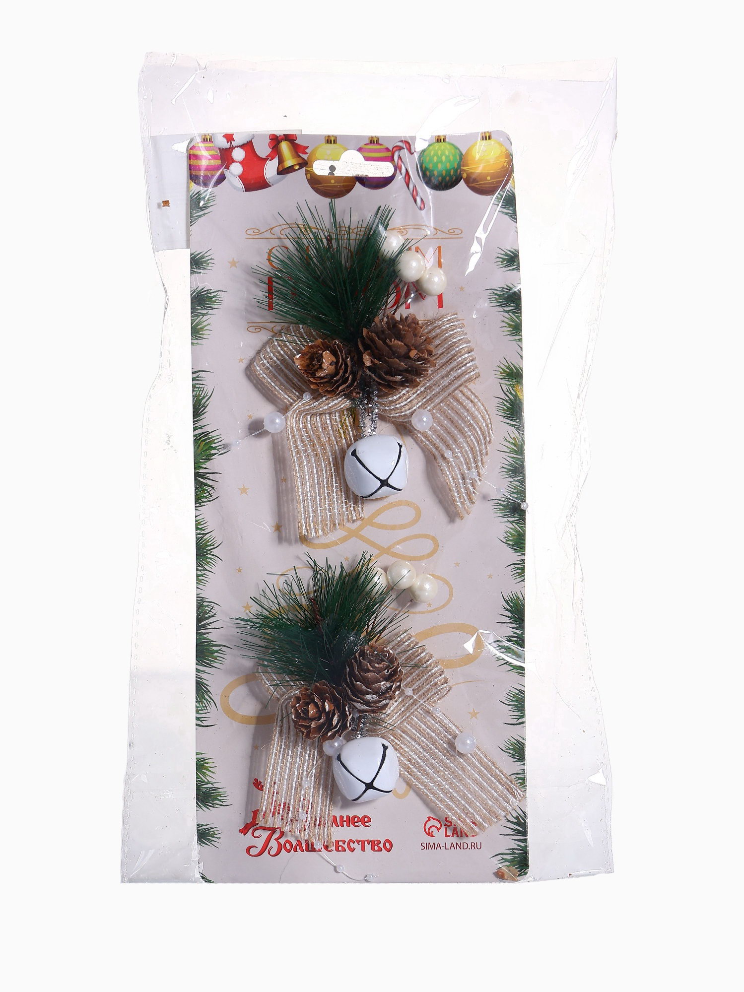 Ёлочные игрушки 2 шт. "Зимнее волшебство. Композиция на бантике с бубенчиком", 11x9 см, 9x11 см., Зимнее волшебство, Китай