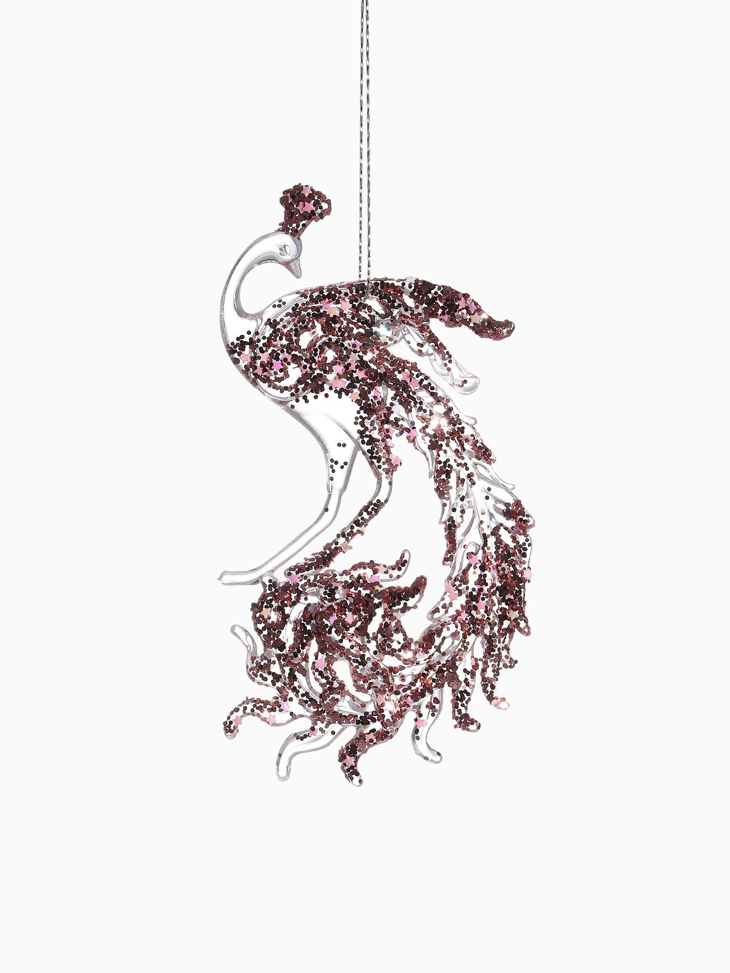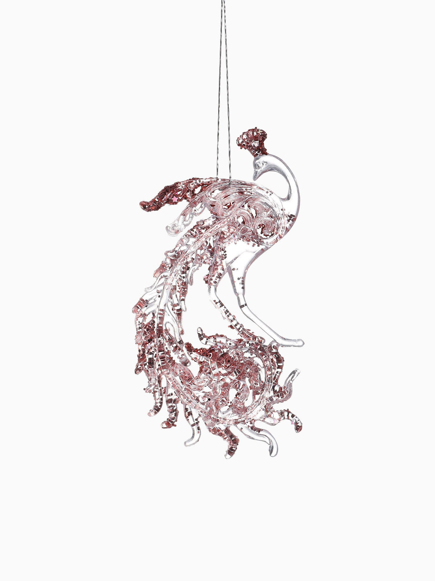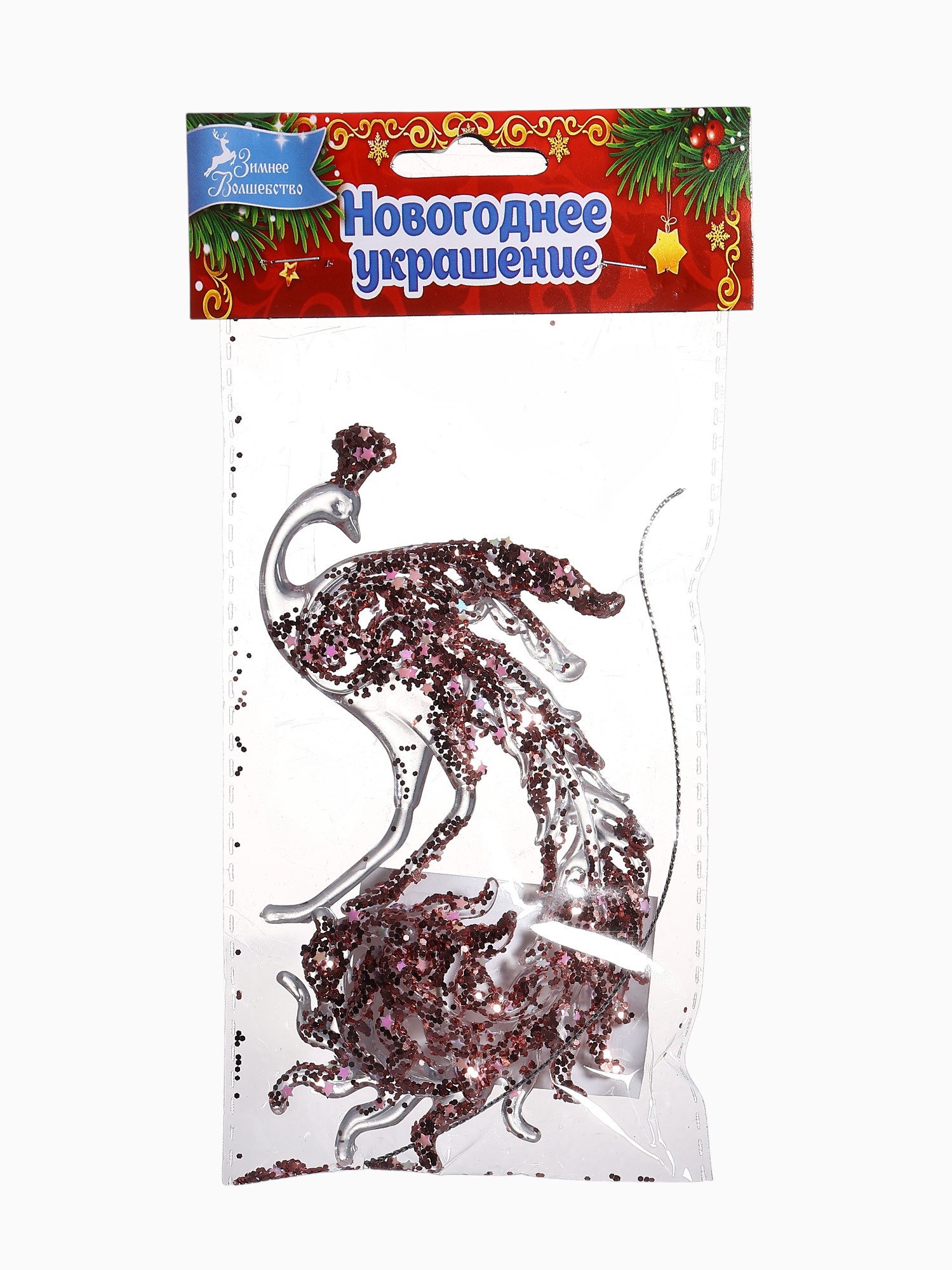 Ёлочная игрушка "Зимнее волшебство. Павлин сияние блеск" пластик, 14x7.5 см, прозрачно-розовый, 7.5x14 см., Зимнее волшебство, Китай