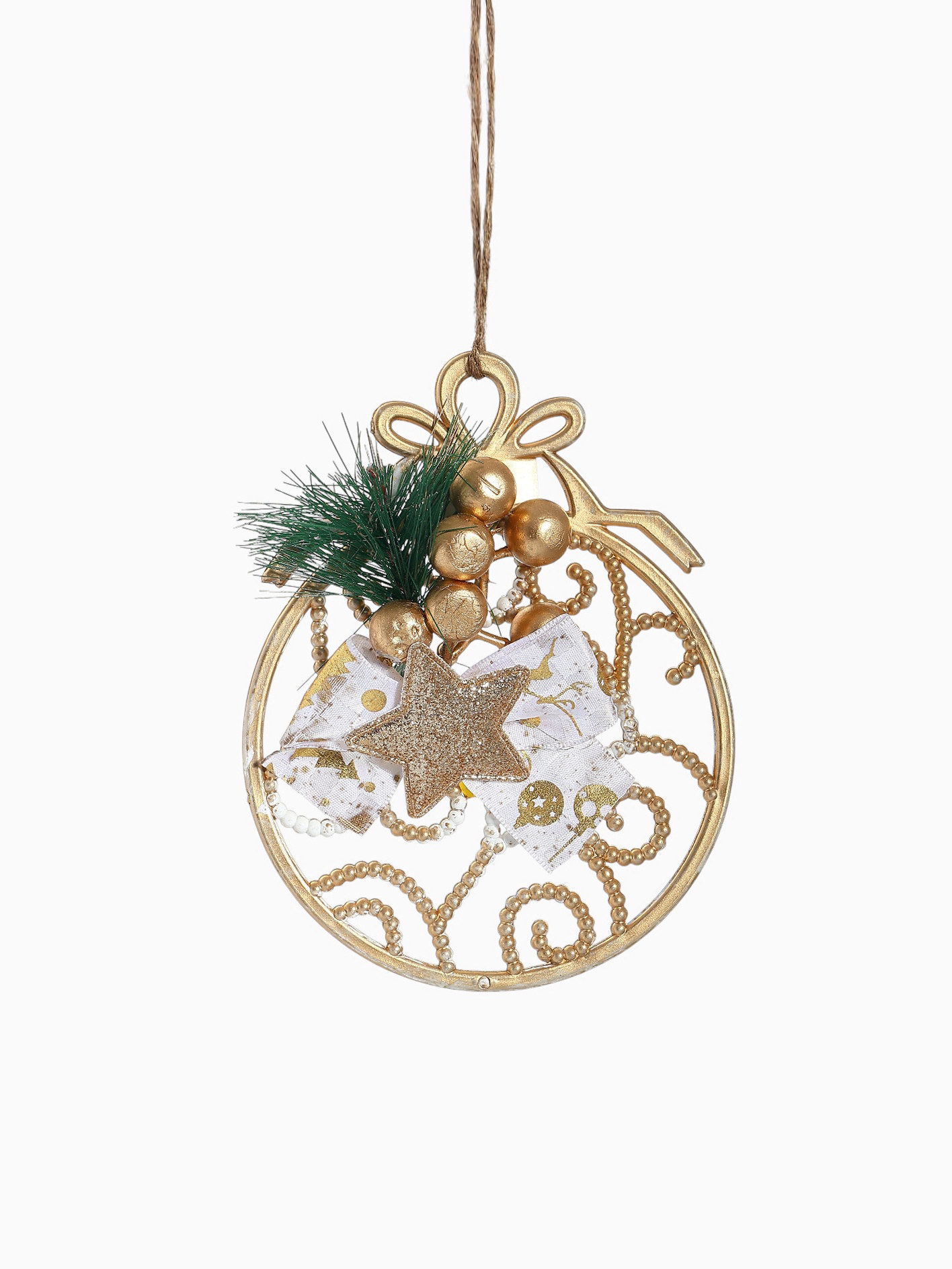 Стиль: Ар-деко, Датский Размер упаковки: 10 x 3 x 13 см. Диаметр шара, см: 10 Тематика праздника: Новый год Символ года: Нет Форма игрушки: Шар Набор: Нет Цвет: Золотистый Особенности: С наполнением tnved: 9505109000 Новогодний шар с декоративной веточкой выполнен из пластика в стиле ар-деко с элементами датского дизайна. Золотистый оттенок и наполненная структура создают глубину и праздничное сияние, подчёркивая изысканность новогоднего интерьера. Диаметр 10 см подходит для разнообразных вариантов украшения ёлки и праздничных композиций. Особенности