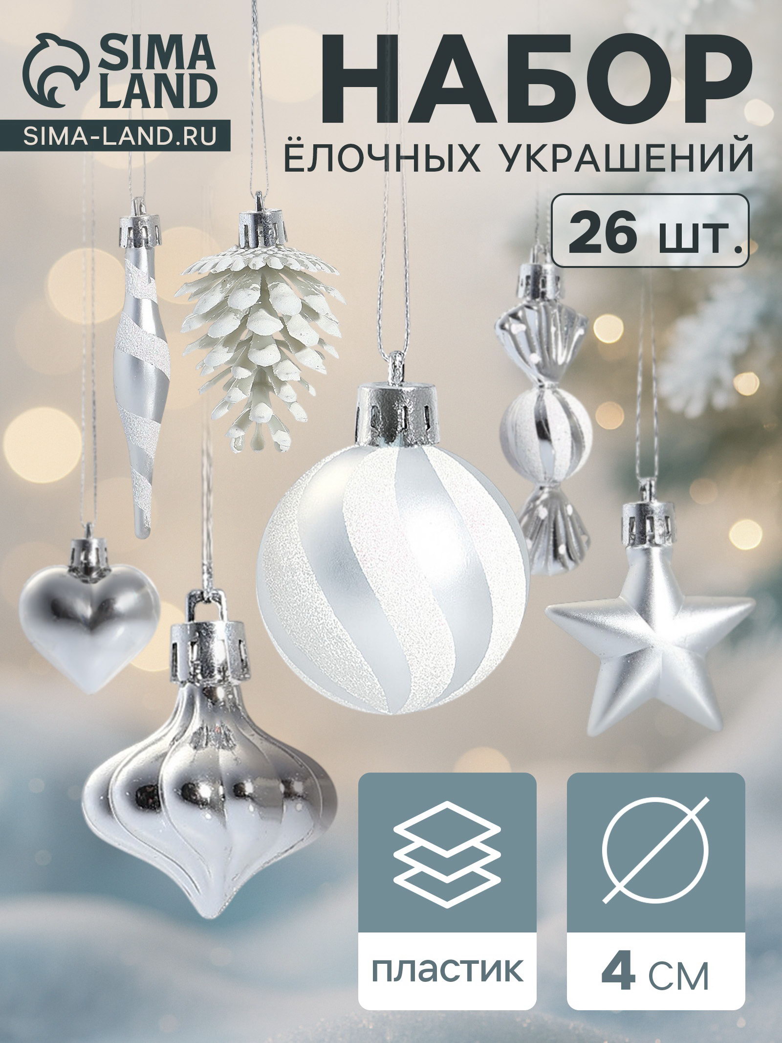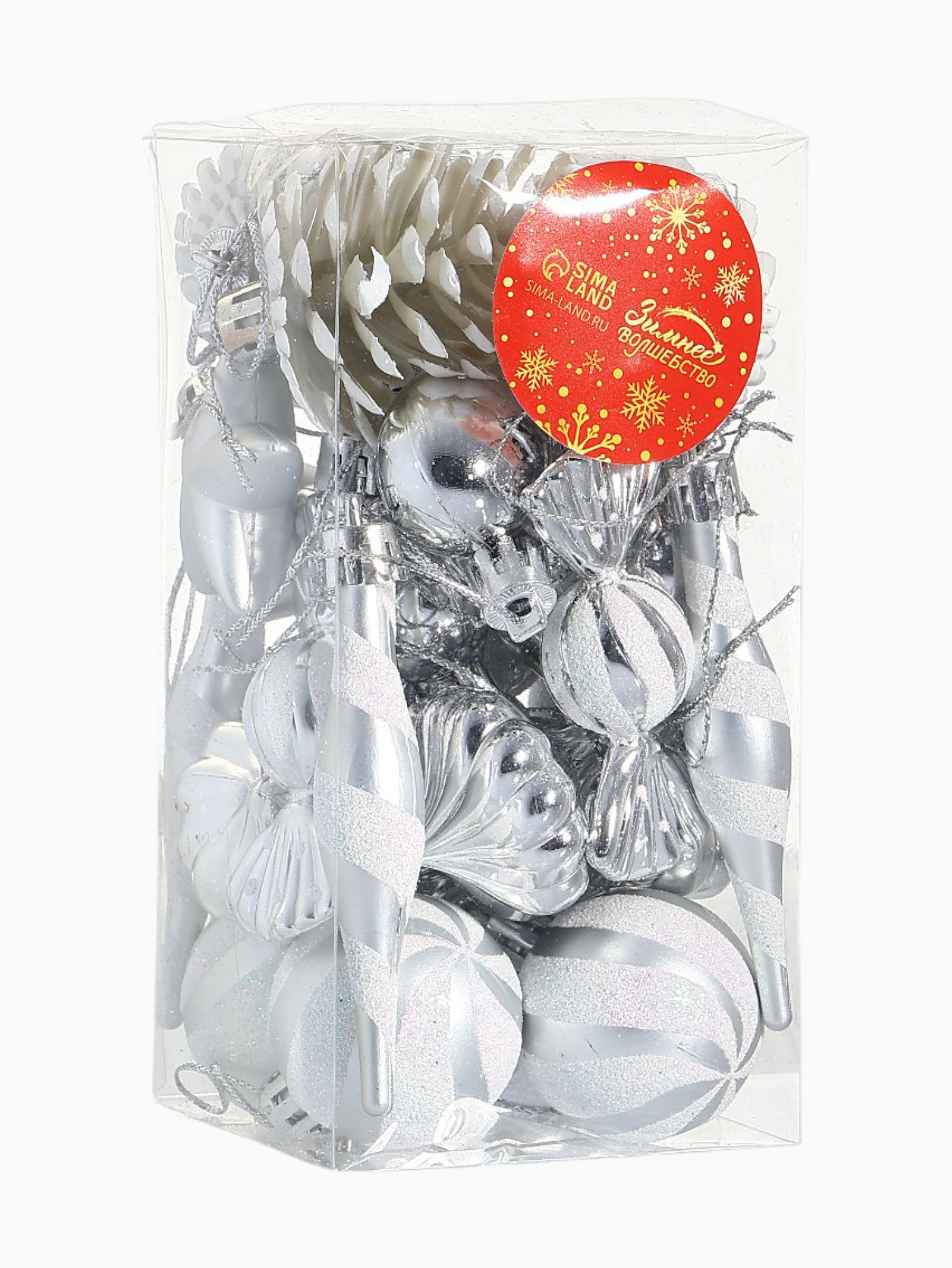 Ёлочные игрушки набор 26 шт. "Праздничный хоровод" 4 см, серебро, 8x8x15.5 см., Зимнее волшебство, Китай