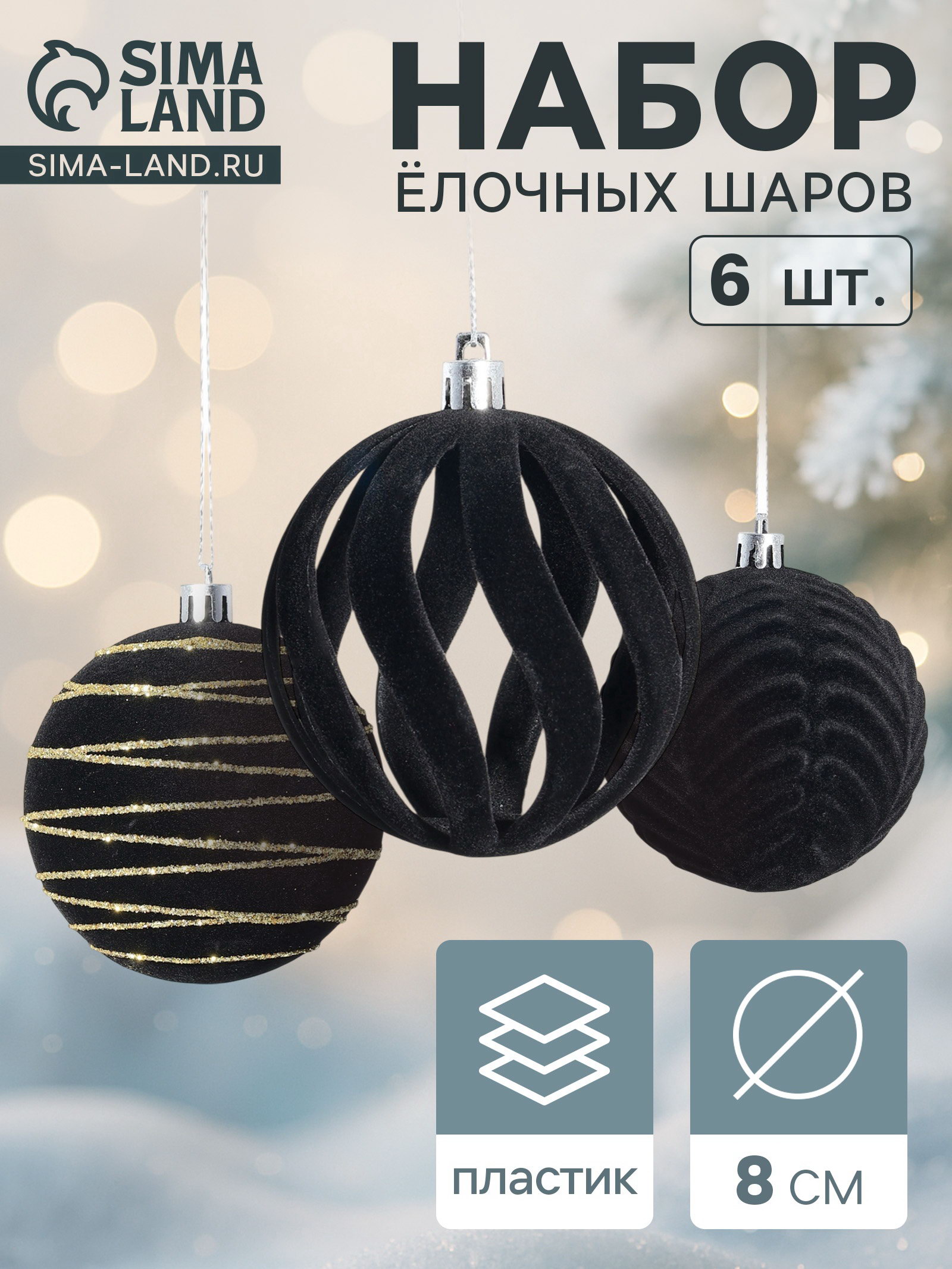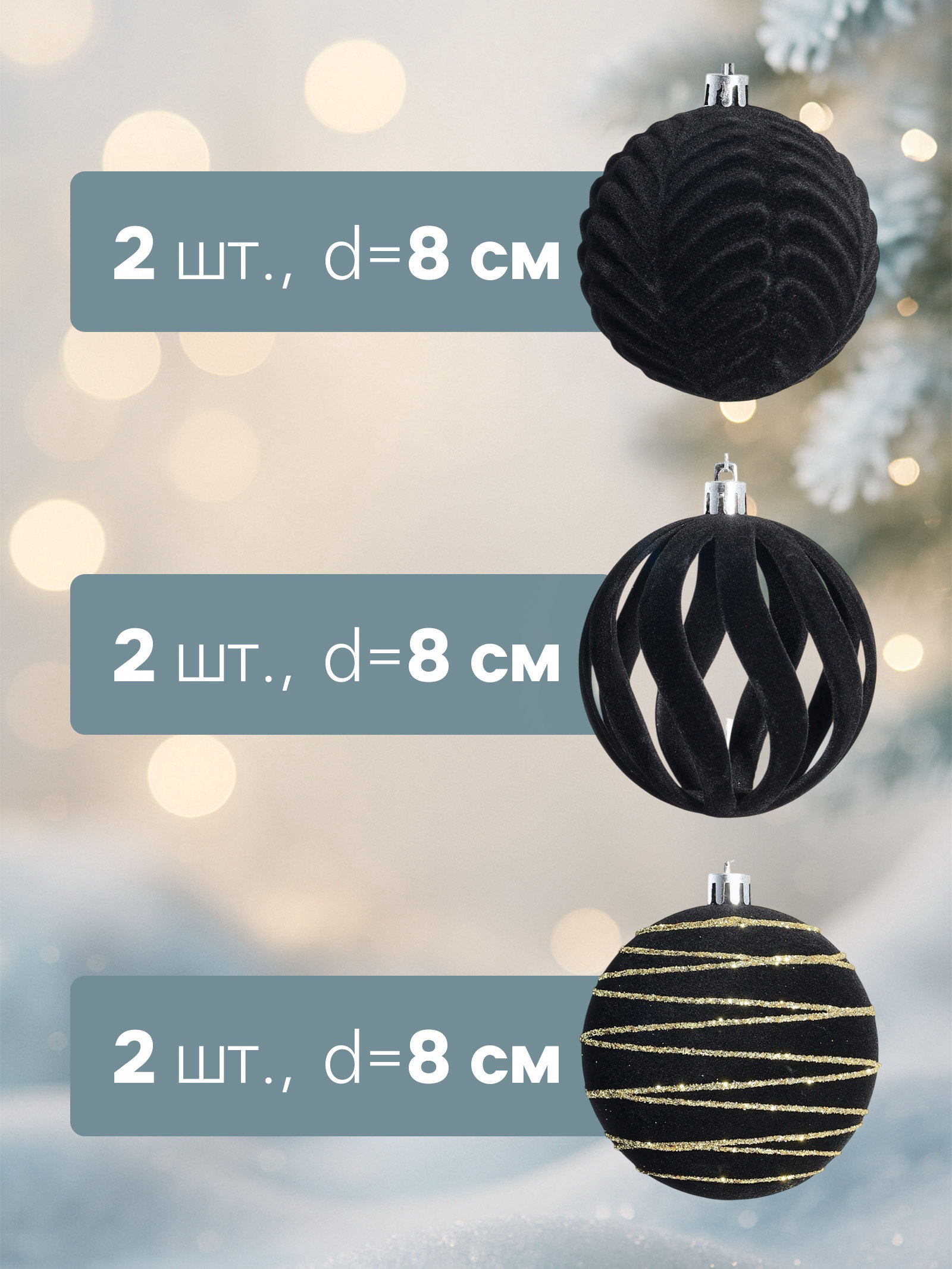 Ёлочные шары набор 6 шт., d=8 см, "Бархат. Карнавал" чёрный, 8x8x8 см., Зимнее волшебство, Китай