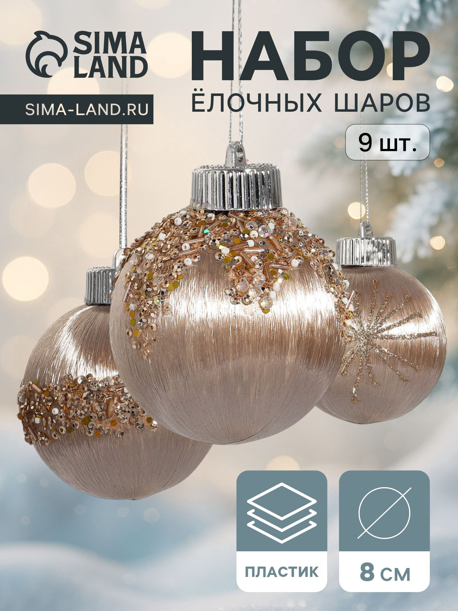 Размер упаковки: 24 x 8 x 24 см. tnved: 9505109000 Диаметр шара, см: 8 Цвет: Золотистый Символ года: Нет Особенности: С наполнением Форма игрушки: Шар Набор: Да В наборе, шт.: 9 Тематика праздника: Новый год Набор ёлочных шаров золотистого цвета изысканный акцент для тех, кто любит праздновать с достоинством. Девять шаров диаметром 8 см с эффектом "грация" и внутренним наполнением создают ощущение лёгкой роскоши: будто каждый украшен каплями света, застывшими в движении. Золотистое сияние мягко отражает огни гирлянд, добавляя ёлке объём и тепло. Когда блеск говорит о вкусе