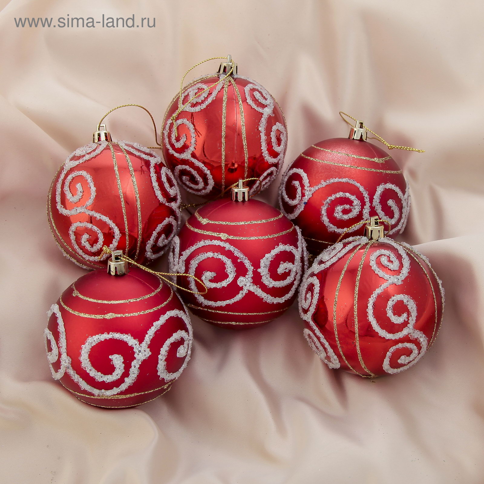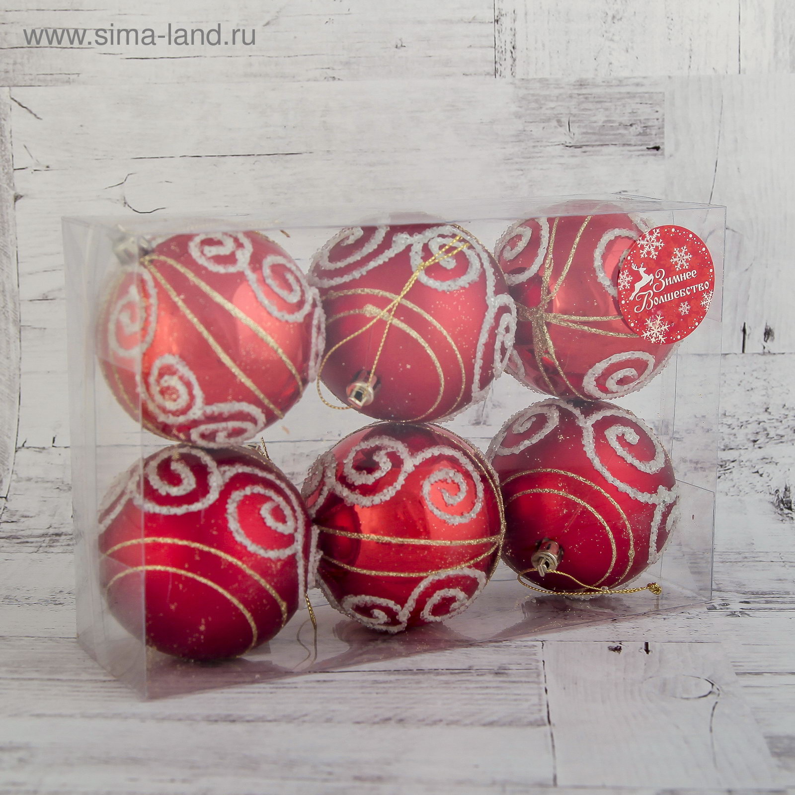 Набор шаров пластик d-8 см, 6 шт "Морозные кружева" красный, 8x8 см., Зимнее волшебство, Китай
