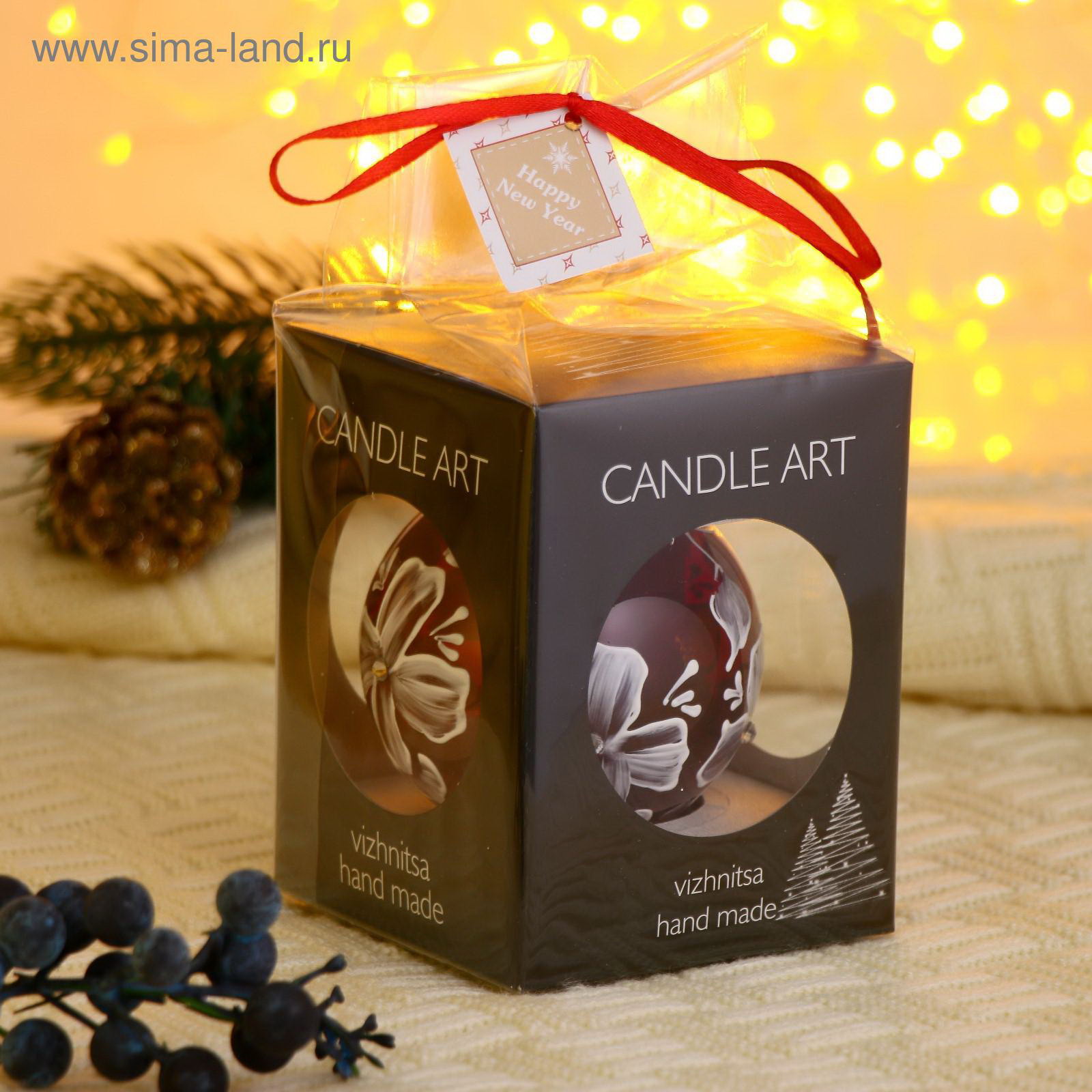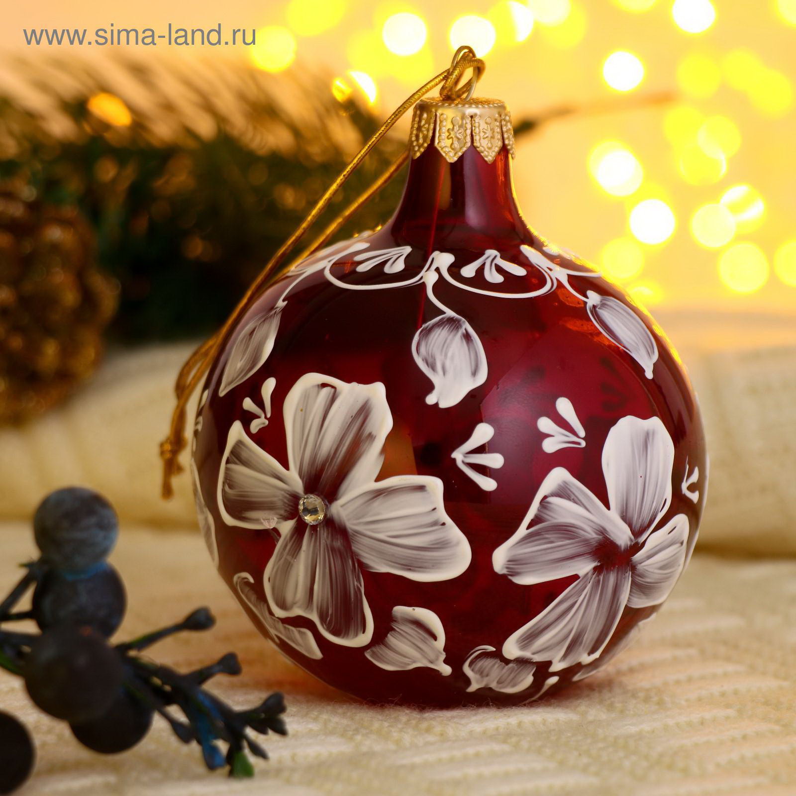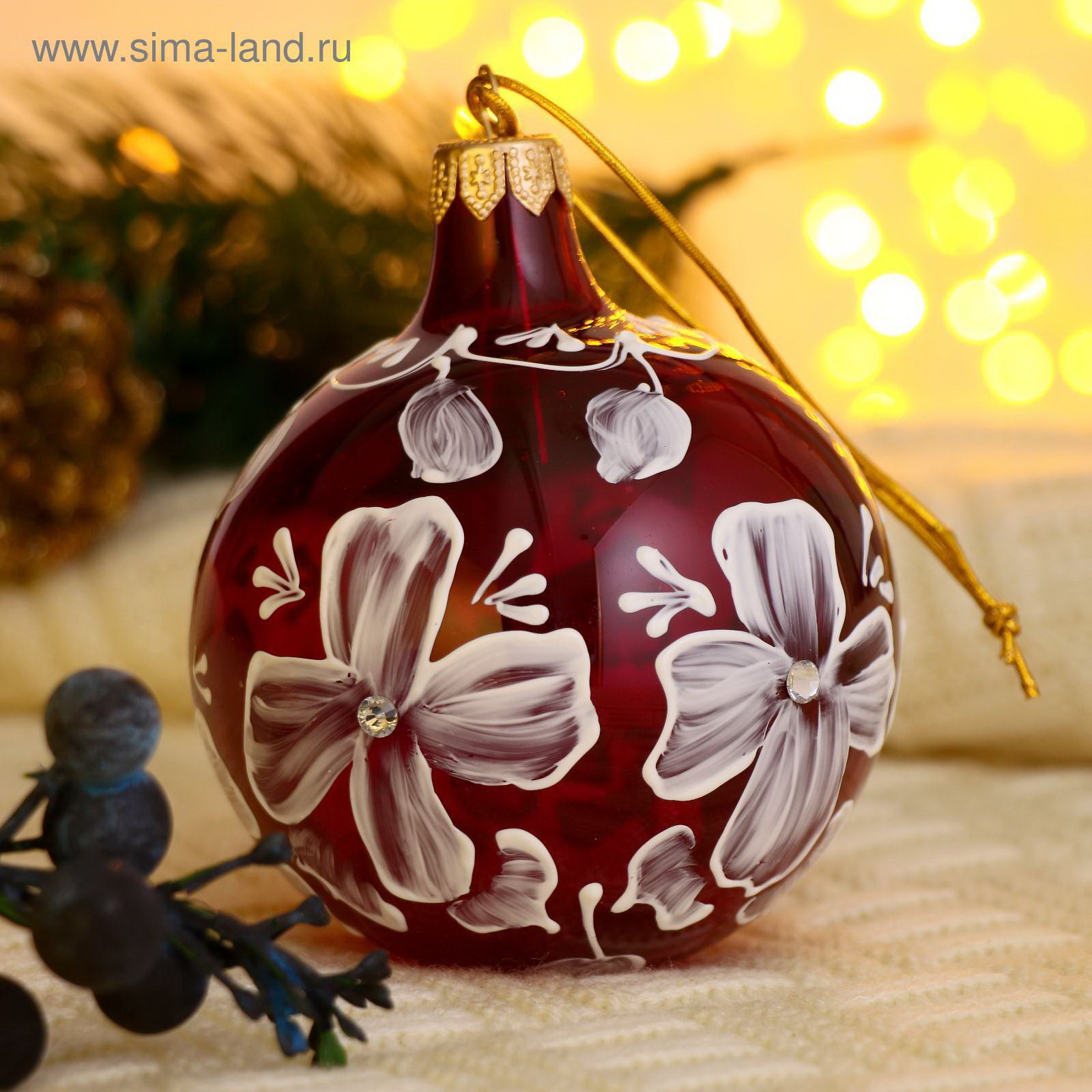 Ёлочный шар d-8 см "Белые незабудки" ручная роспись, бордово-белый, 8 см., Россия