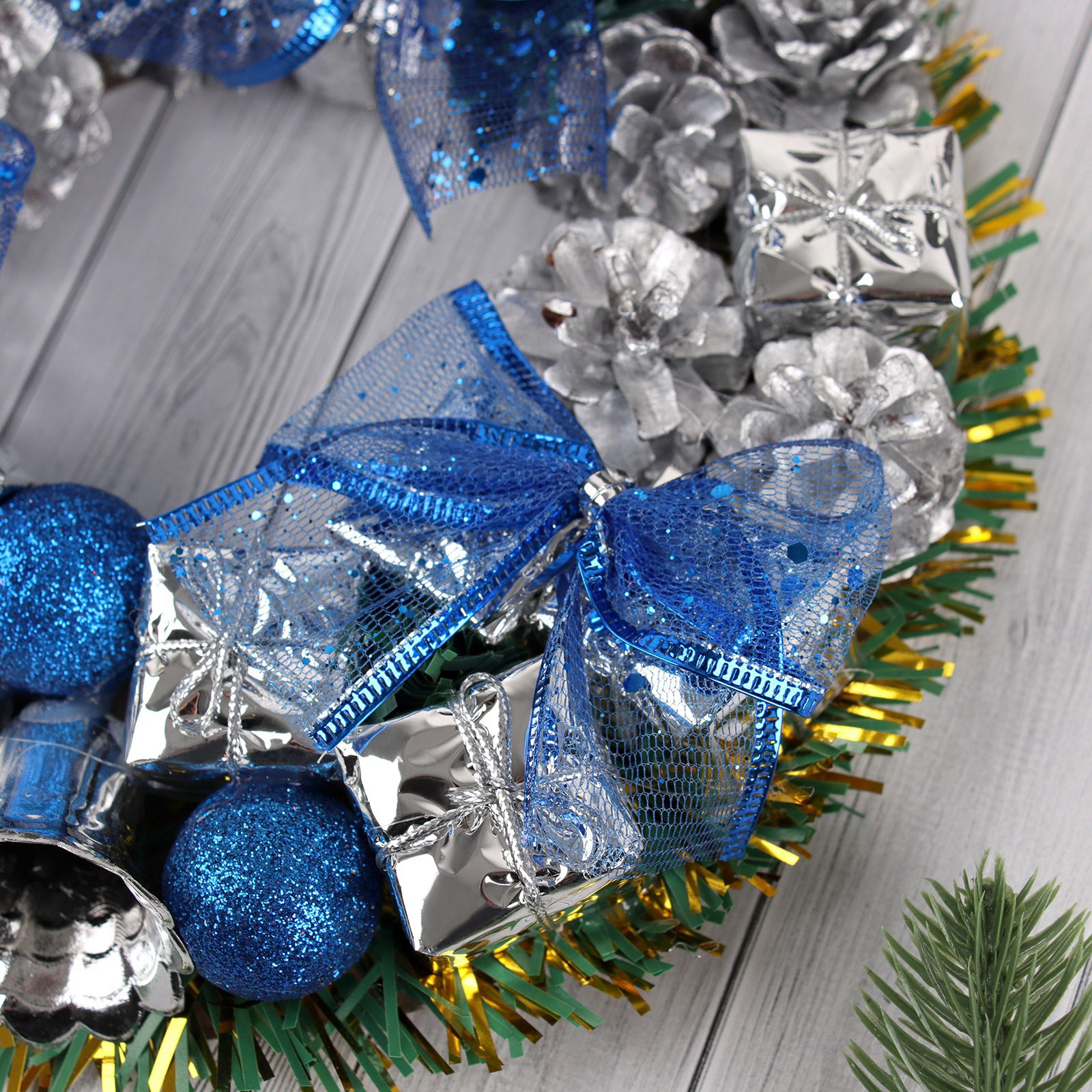 Размер упаковки: 22 x 22 x 4 см. Символ года: Нет Цвет: Синий Вид: Венки tnved: 9505109000 Тематика праздника: Новый год Стиль: Фьюжн Позвольте Вашему дому засиять в новогодней атмосфере с очаровательными украшениями. Созданные для тех, кто ценит тепло и уют зимних праздников. Венок станет ярким акцентом вашего интерьера.