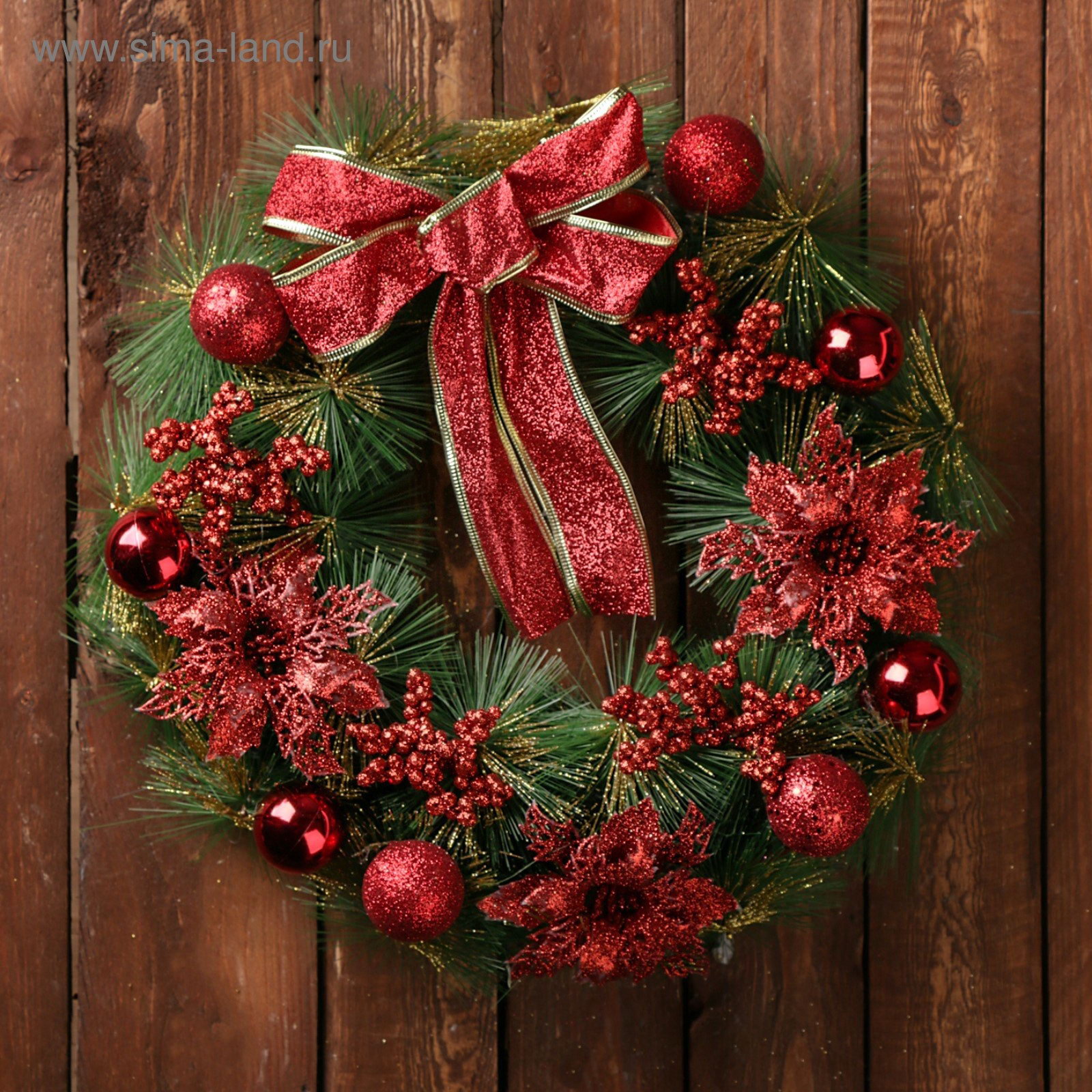 Венок новогодний d=36 см "Зимнее волшебство. Бант", с красными ягодами и цветами, 36х36х36 см., Зимнее волшебство, Китай