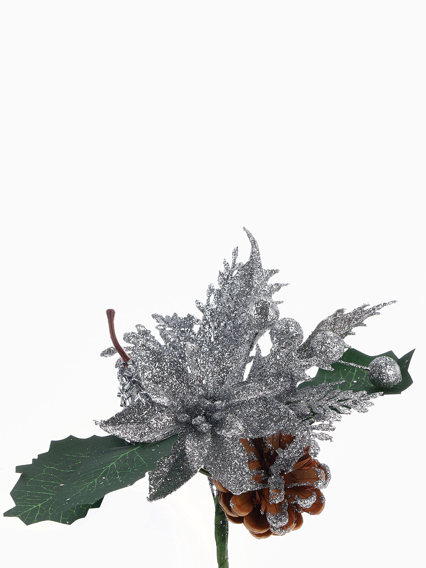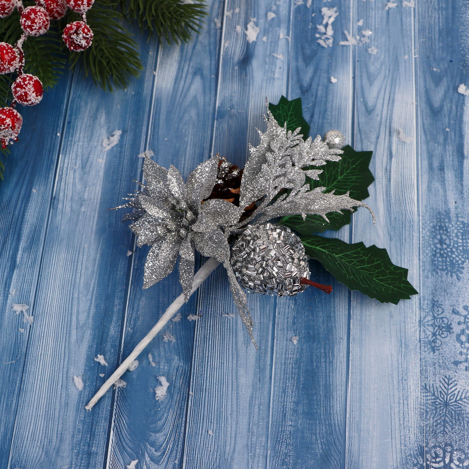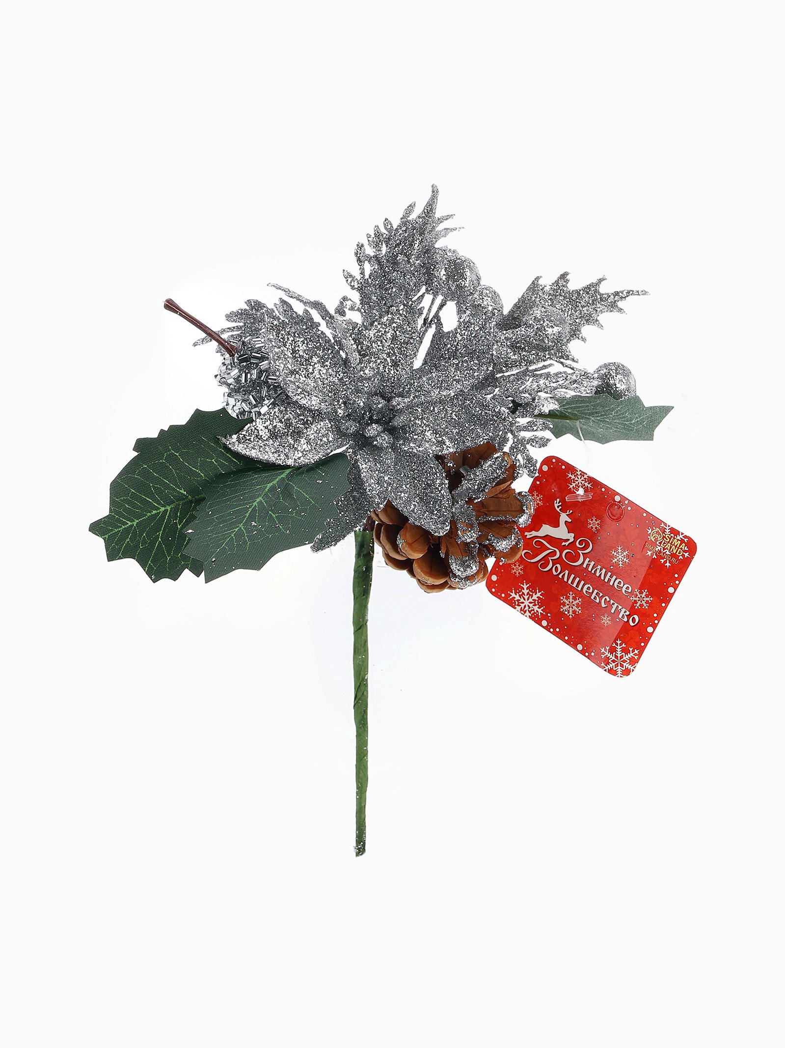 Еловая ветка декоративная "Зимнее волшебство. Грёзы", с цветком, 16 см, 16 см., Зимнее волшебство, Китай