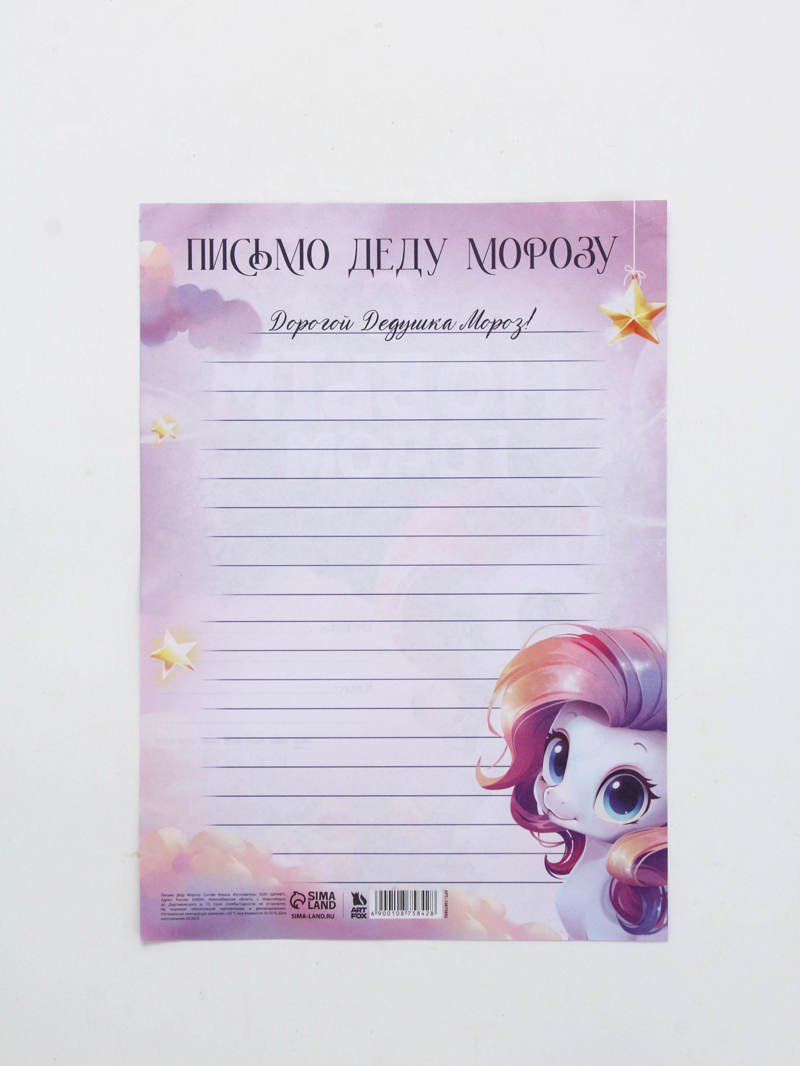 Размер упаковки: 20.3 x 28.5 x 0.1 см. tnved: 4820109000 Особенности письма: Без особенностей Формат письма: А4 Отделка: Без отделки Тематика праздника: Новый год Адресат: Без адресата Символ года: Символ года 2026 (Лошадь) Набор: Нет Для кого: Для девочки Возраст: Детский | ||