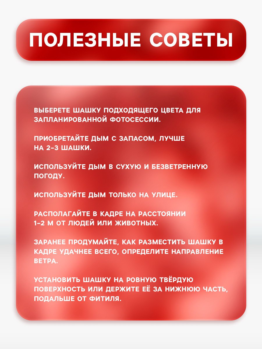 Запрет реализации по сегментам: 00000000534, 00000000550, 00000000594 Цвет дыма: Бирюзовый, Голубой, Красный, Малиновый, Фиолетовый Размер упаковки: 2.5 x 2.5 x 15.5 см. Набор: Нет Вид: Цветной дым tnved: 3604100000 Температурное ограничение: Нет Заряд, дюйм: 0.8 Время работы, сек: 60 Количество залпов: 1 Цветной дым это пиротехническое изделие, создающее красивые цветные облака для привлечения внимания, организации фотосессий, корпоративных мероприятий и гендер-пати. Он прост в использовании, безопасен для кожи и волос, не содержит токсичных веществ. Изделие оснащено фитилём. Расправьте его от скотча, уберите защиту со стороны фитиля. Установите шашку на землю и подожгите. Когда пойдёт дым, можно взять шашку за самую нижнюю часть, отведя её от себя на расстояние вытянутой руки. Не направляйте на одежду. Как правильно использовать