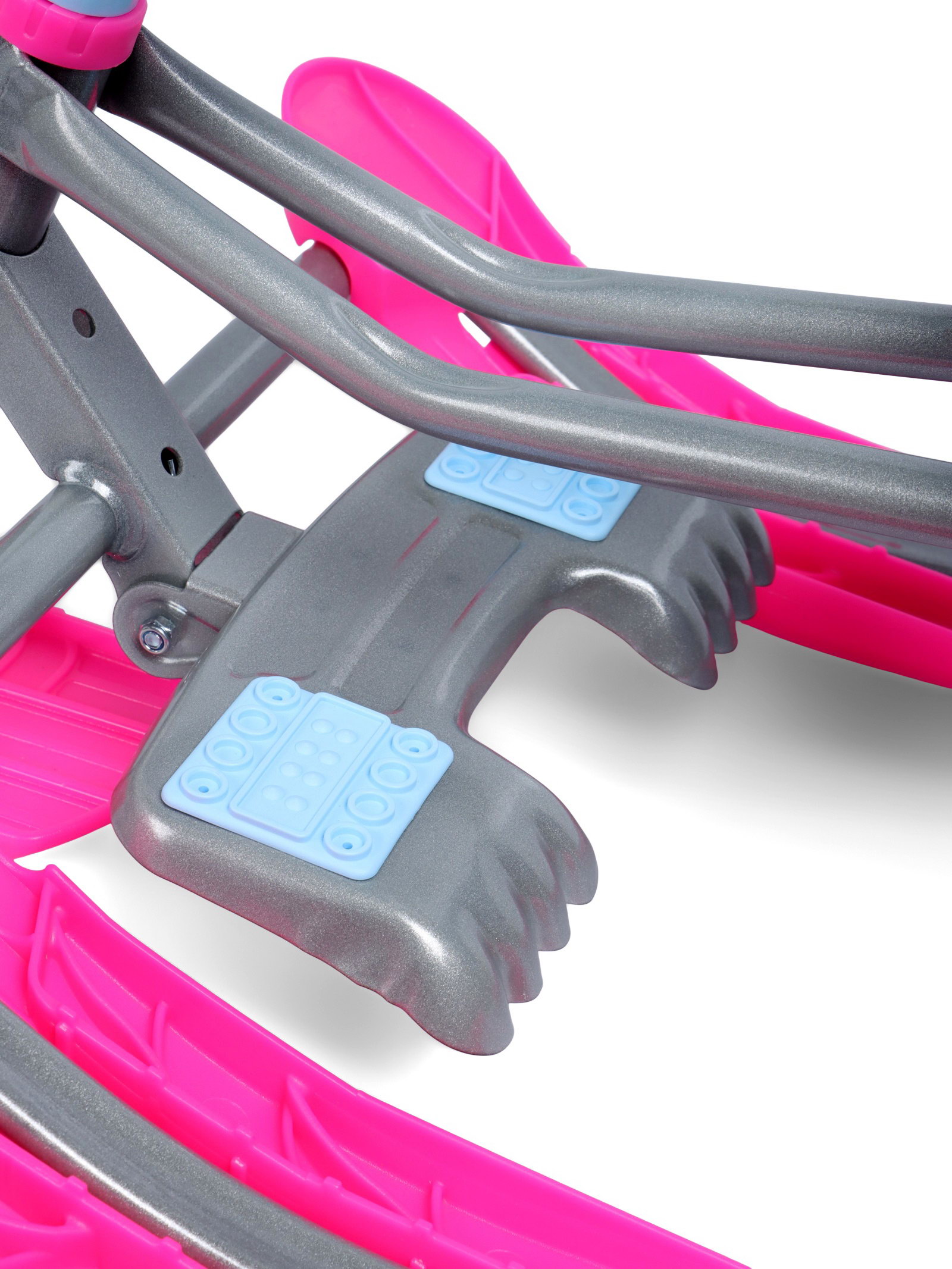 Цвет: Голубой, Розовый Ремень безопасности: 2-точечный (поясной), Да Размер упаковки: 46 x 25 x 73 см. Для кого: Для девочки tnved: 9506999000 Возраст: От 4 лет Наличие спинки: Да Ручка для родителей: Нет Maксимальная нагрузка, кг: 100 Буксировочный трос: Автоматическая намотка Тип руля: Авторуль Размер сиденья, см: 20 x 45 Амортизатор: Да Высота до сиденья, см: 29 Регулировка посадочных мест: Нет Снегокат предназначен для перевозки детей по плотному снегу или льду, катанию с горок. Имеет сварную конструкцию из стальных труб и пластиковых элементов. Оснащён мягким сиденьем, обтянутым искусственной кожей с рисунком, складной спинкой и двухточечным ремнём безопасности. Оборудован буксировочным тросом с автоматической намоткой и системой амортизации, которая обеспечивает комфортную поездку по крутым горкам и неровным поверхностям. Усиленный тормоз эффективен на обледенелой поверхности. Характеристики