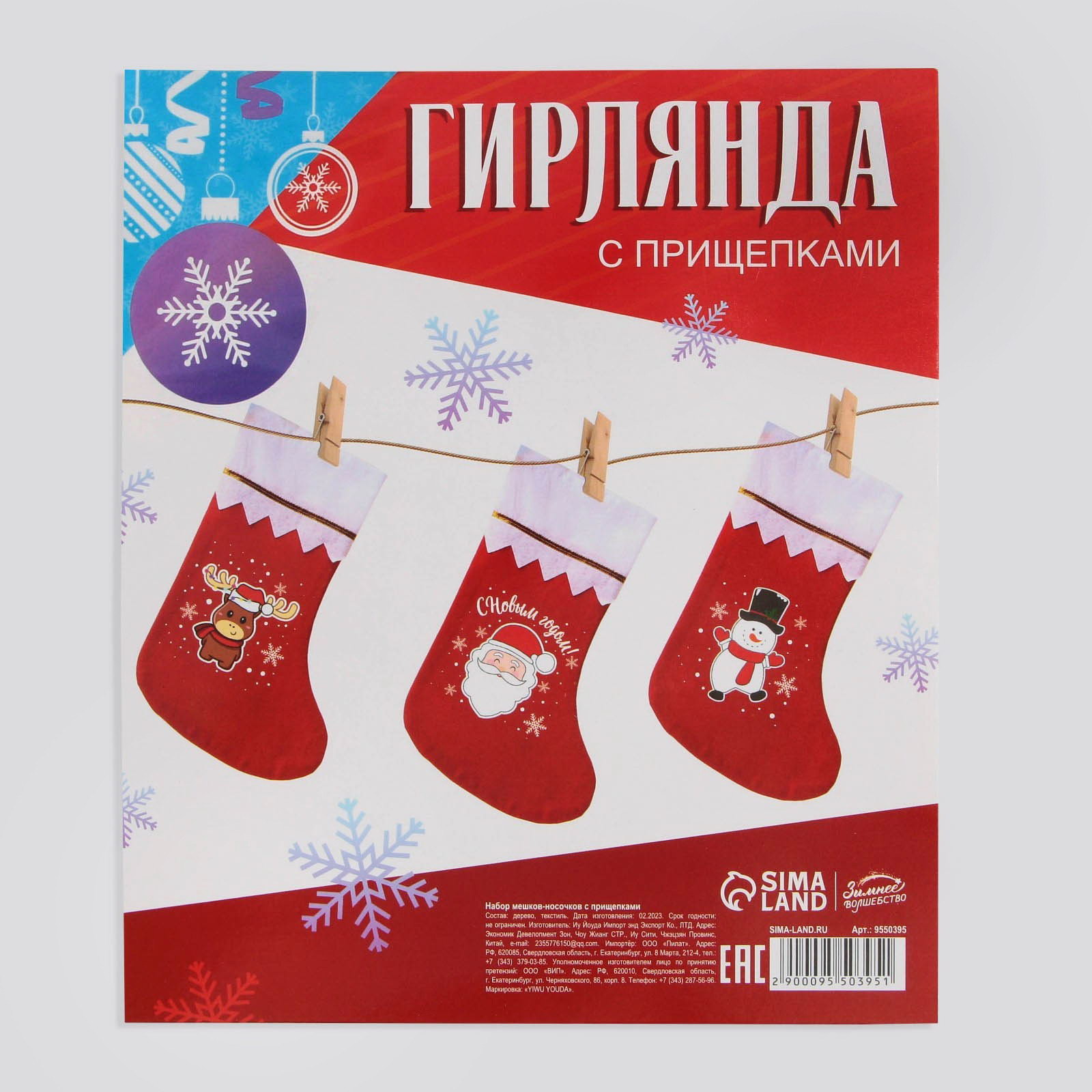Носки для подарков новогодние "Весёлого Нового года!", 3 мешка, верёвка, 3 прищепки, 15x1x17.5 см., Сима-ленд, Китай