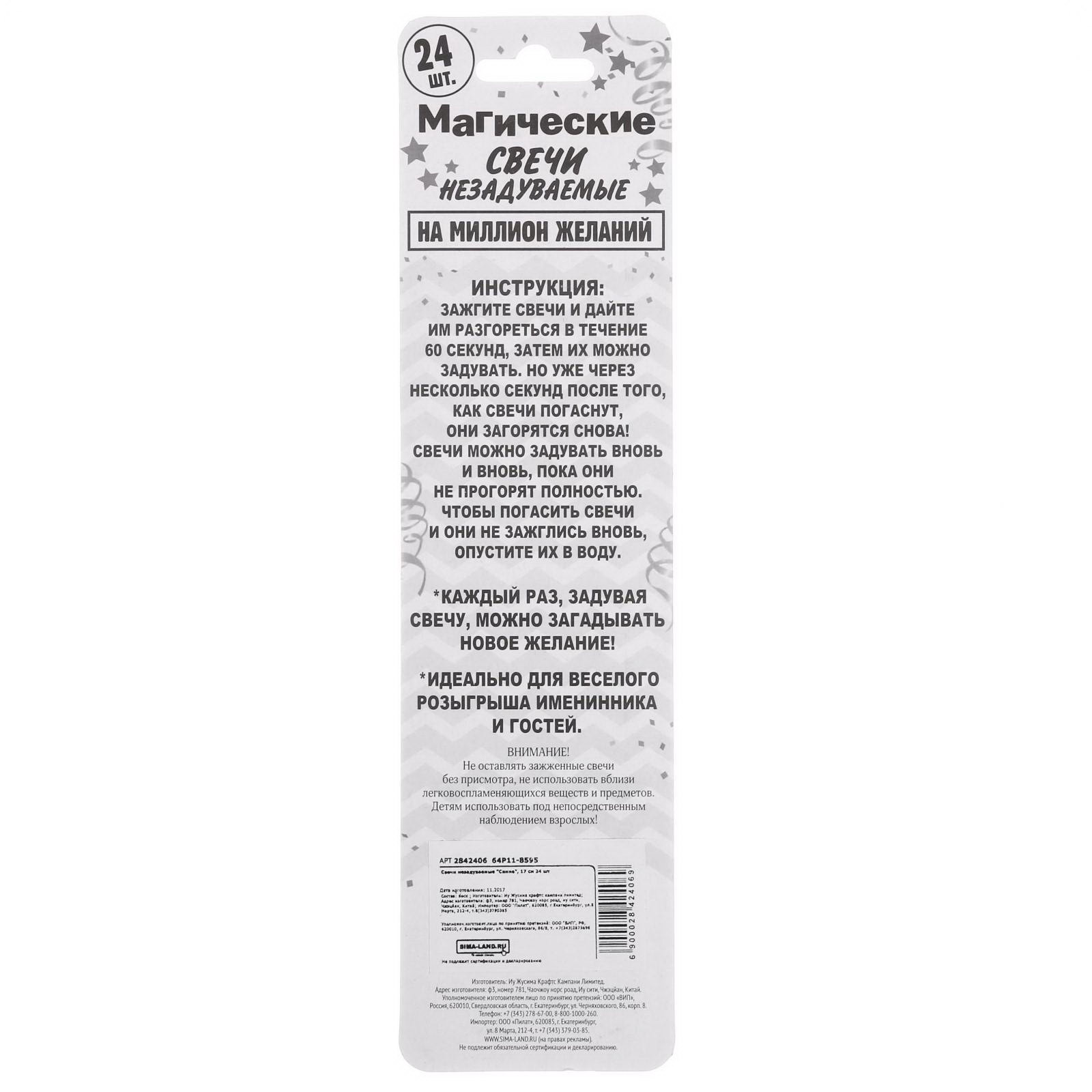 Вид упаковки: Блистер, Подложка Размер упаковки: 6 x 24 x 0.5 см. Для кого: Унисекс tnved: 3406000000 tnved: 3406000000 Состав: Воск Цифра: Без цифры Темпер. ограничение НЕ ВЫШЕ ℃: +25 Вид ароматизатора: Свеча Темпер. ограничение НЕ НИЖЕ ℃: -10 Тематика праздника: День рождения Цвет: Синий Температурное ограничение: Нет В наборе, шт.: 24 Набор: Да Тематика: Праздник Высота свечи, см: 16.8 Форма свечи: Цилиндр Свечи для торта - это неотъемлемый атрибут праздника. Набор свечей станет прекрасным украшением торта и других кондитерских изделий по случаю дня рождения, юбилея и любого другого торжества. Украсьте угощение стильными свечами, чтобы сделать особенный день ещё более ярким и незабываемым. Для того, чтобы свечи не задувались, им нужно дать 60 секунд разгореться, после чего их можно будет задувать, но уже через несколько секунд, как они погаснут, свечи загорятся снова. Для того,чтобы свечи все-таки потушить, их рекомендуется примочить водой или придавить фитиль свечи. Изготовлены из высокоочищенного пищевого парафина, который не влияет на вкусовые качества блюд, а удобная упаковка помогает сохранять свечи при длительном хранении и транспортировке. | ||
