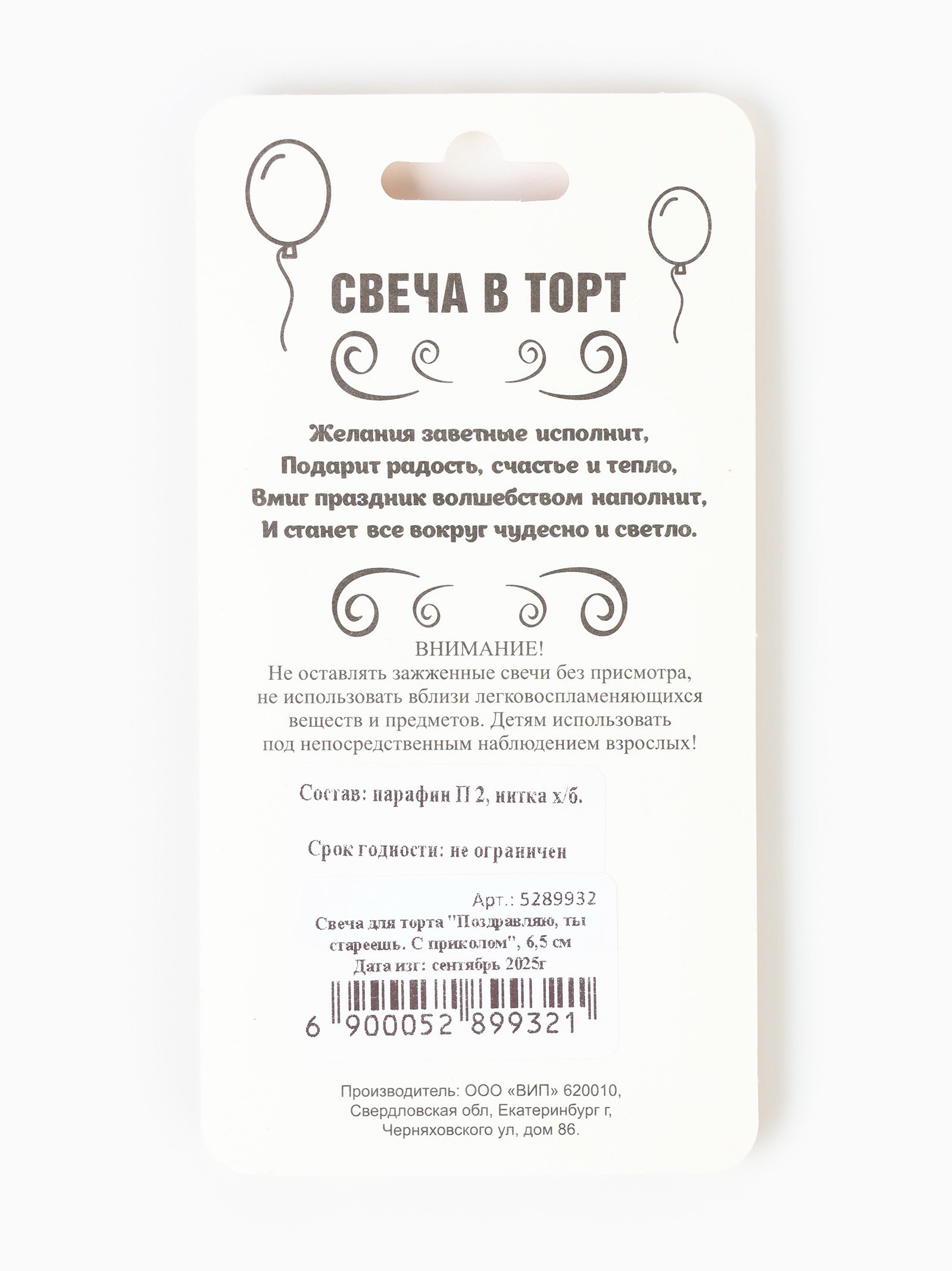 Размер упаковки: 7.5 x 0.7 x 14.5 см. Вид: Свечи Состав: Парафин Цифра: Без цифры Для кого: Для женщины Цвет: Чёрный Форма свечи: Фигурная В наборе, шт.: 1 tnved: 3406000000 Температурное ограничение: Нет Высота свечи, см: 8.5 Высота свечи без шпажки, см: 6.5 Уважаемые клиенты! В связи с наступлением осенне-зимнего периода напоминаем Вам, что на свечах с лаковым покрытием от резких перепадов температур или при низкой температуре (ниже – 20С) может отслоиться (вздуться) лак. Явление носит, как правило, обратимый характер. При транспортировке в зимнее (холодное) время года коробки со свечами вскрывать после того, как они постоят на Вашем теплом складе не менее суток. Праздничный торт – традиционный атрибут любого дня рождения: без него не обходится ни детский праздник, ни грандиозное событие в честь долгожданного юбилея. Украсьте угощение тематическими свечами, чтобы сделать особенный день в году ещё более ярким и незабываемым. Ведь задувание свечей вызывает бурные эмоции и у взрослых, и у детей, потому что в любом возрасте мы все мечтаем об исполнении желаний и для всех нас это один из самых трогательных и волшебных моментов. | ||