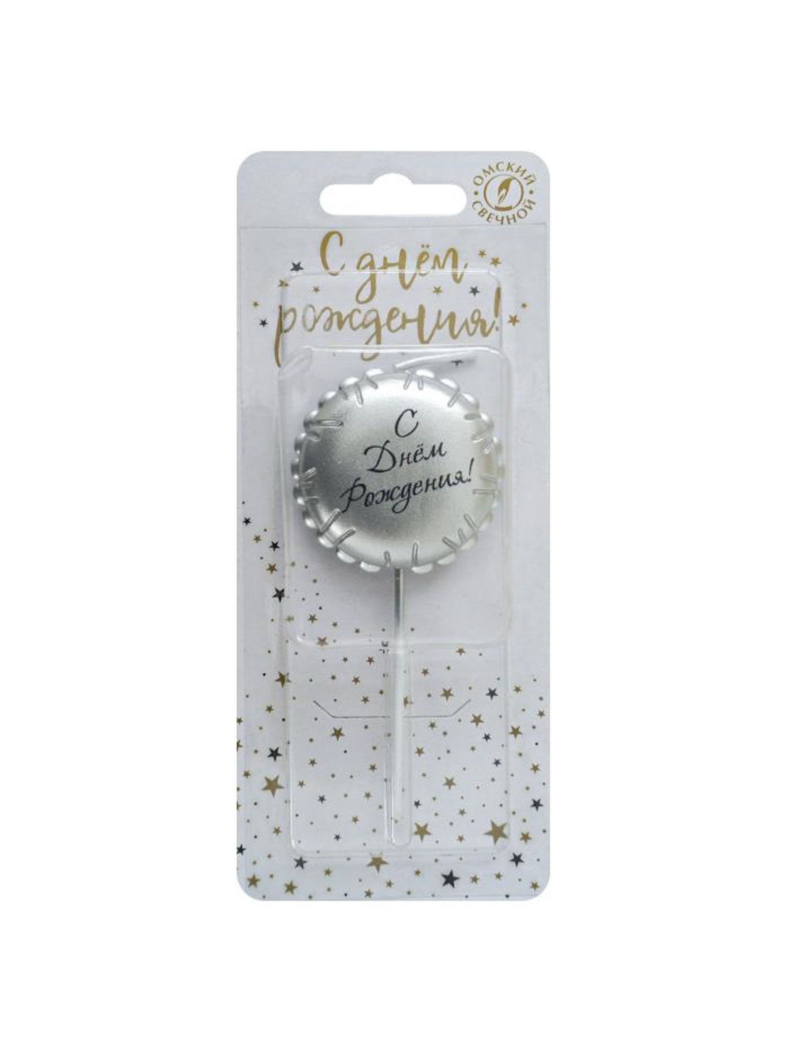 Свеча в торт "С днем рождения", серебряная, Омский свечной завод, Россия