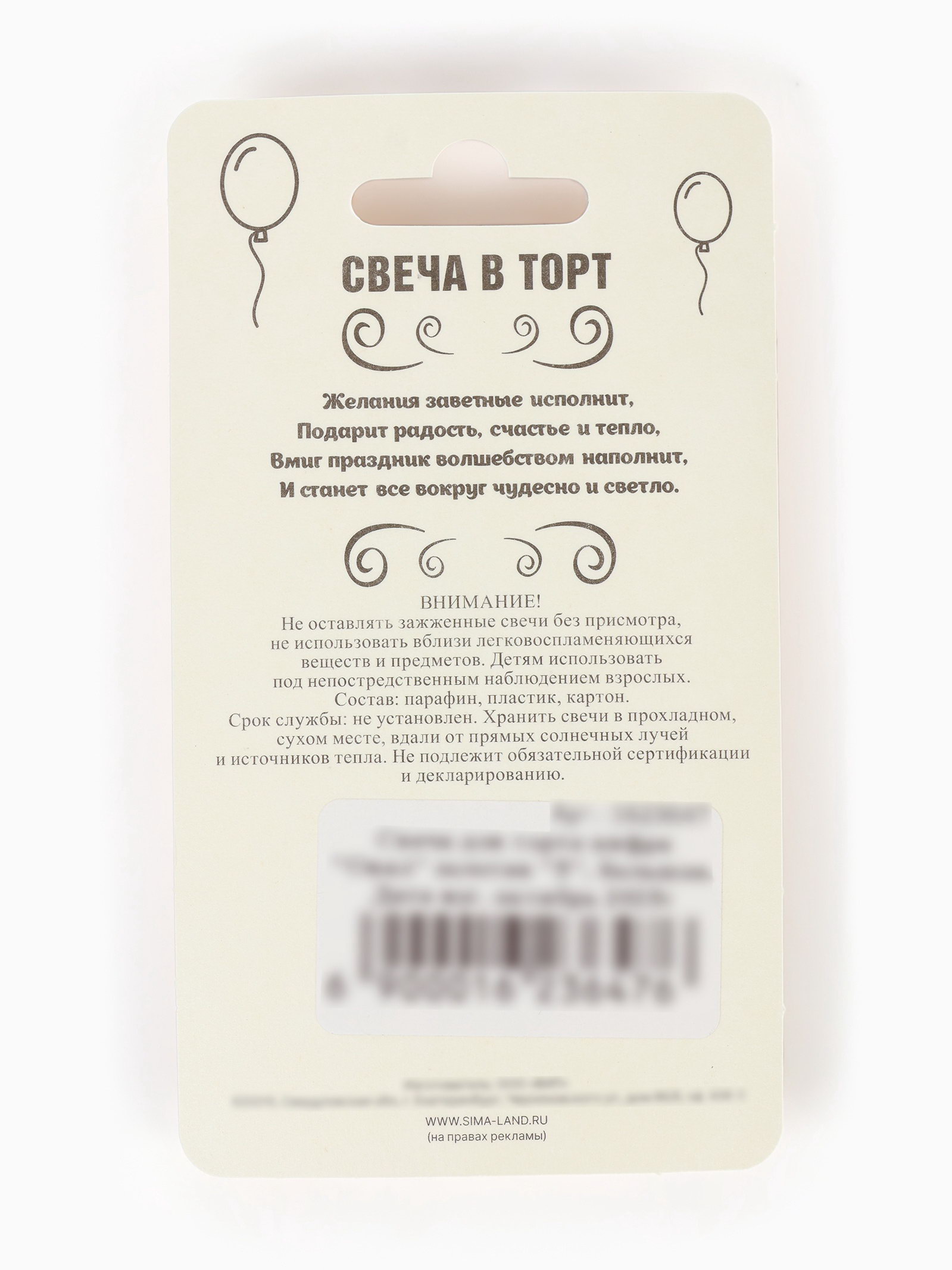 Размер упаковки: 6.5 x 1.4 x 11.5 см. Для кого: Унисекс Высота свечи, см: 7 Состав: Парафин В наборе, шт.: 1 Форма свечи: Цифры tnved: 3406000000 Набор: Нет Цифра: 5 Цвет: Золотистый Высота свечи без шпажки, см: 5.5 Уважаемые клиенты! В связи с наступлением осенне-зимнего периода напоминаем Вам, что на свечах с лаковым покрытием от резких перепадов температур или при низкой температуре (ниже – 20С) может отслоиться (вздуться) лак. Явление носит, как правило, обратимый характер. При транспортировке в зимнее (холодное) время года коробки со свечами вскрывать после того, как они постоят на Вашем теплом складе не менее суток. Несколько праздников – одно решение. Свечи-цифры – это отличный способ подчеркнуть важную дату или годовщину значимого события: день рождения, годовщина со дня бракосочетания, юбилей кота, празднование по поводу нескольких лет со дня основания фирмы. Свечи подойдут для торта, пирога, капкейка, мороженого или любого другого десерта. Создавайте свой уникальный декор. Комбинируйте цифры, сочетайте между собой различные стилистические решения. | ||