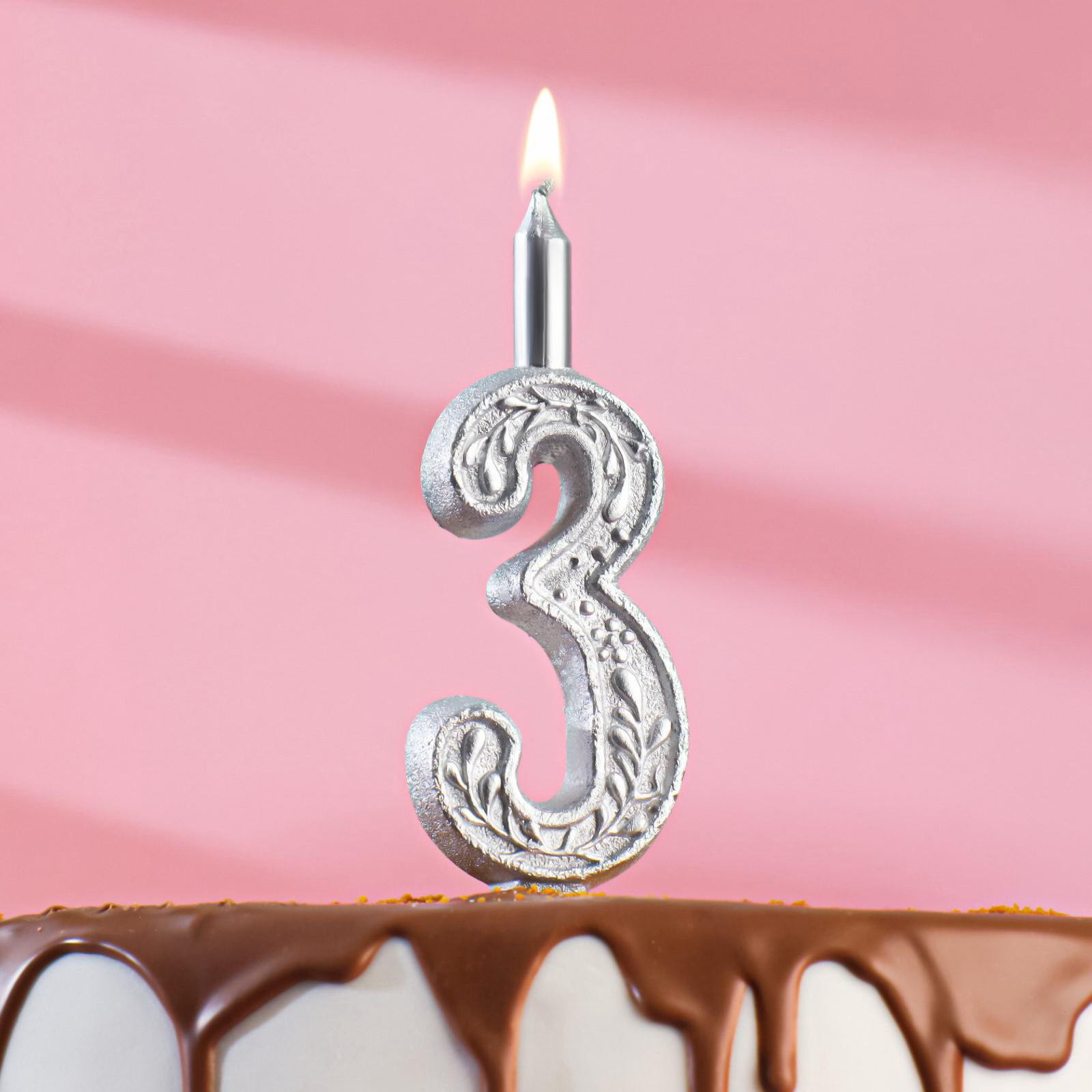 Свеча для торта "Цифра 3", 10.2 см, серебряная, Омский свечной завод, Россия