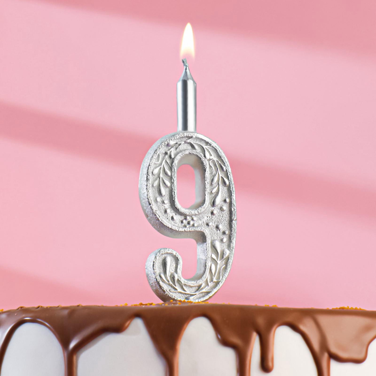 Свеча для торта "Цифра 9", 10.2 см, серебряная, Омский свечной завод, Россия