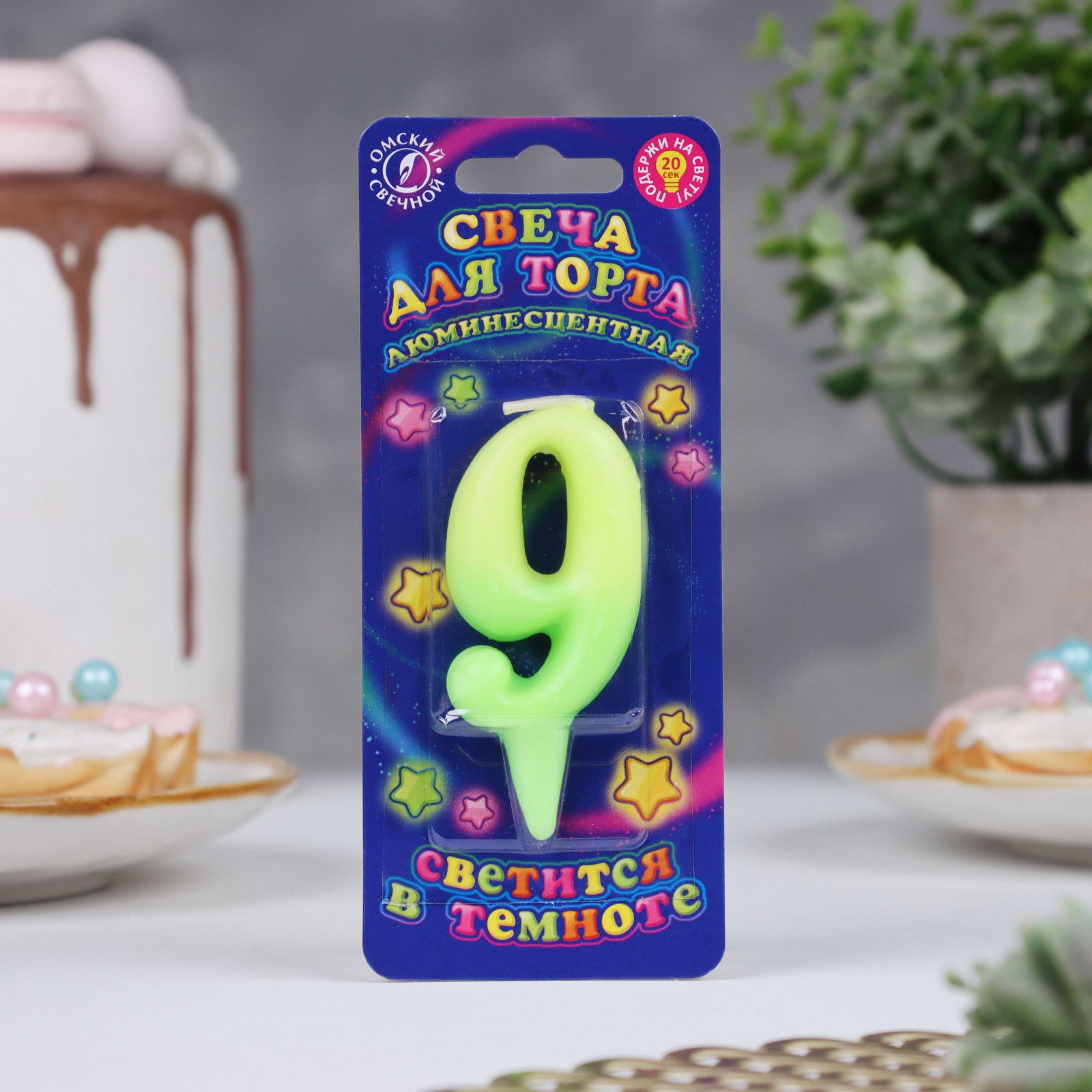 Свеча для торта цифра "Люминесцентная", 5.5 см, цифра "9", Омский свечной завод, Россия