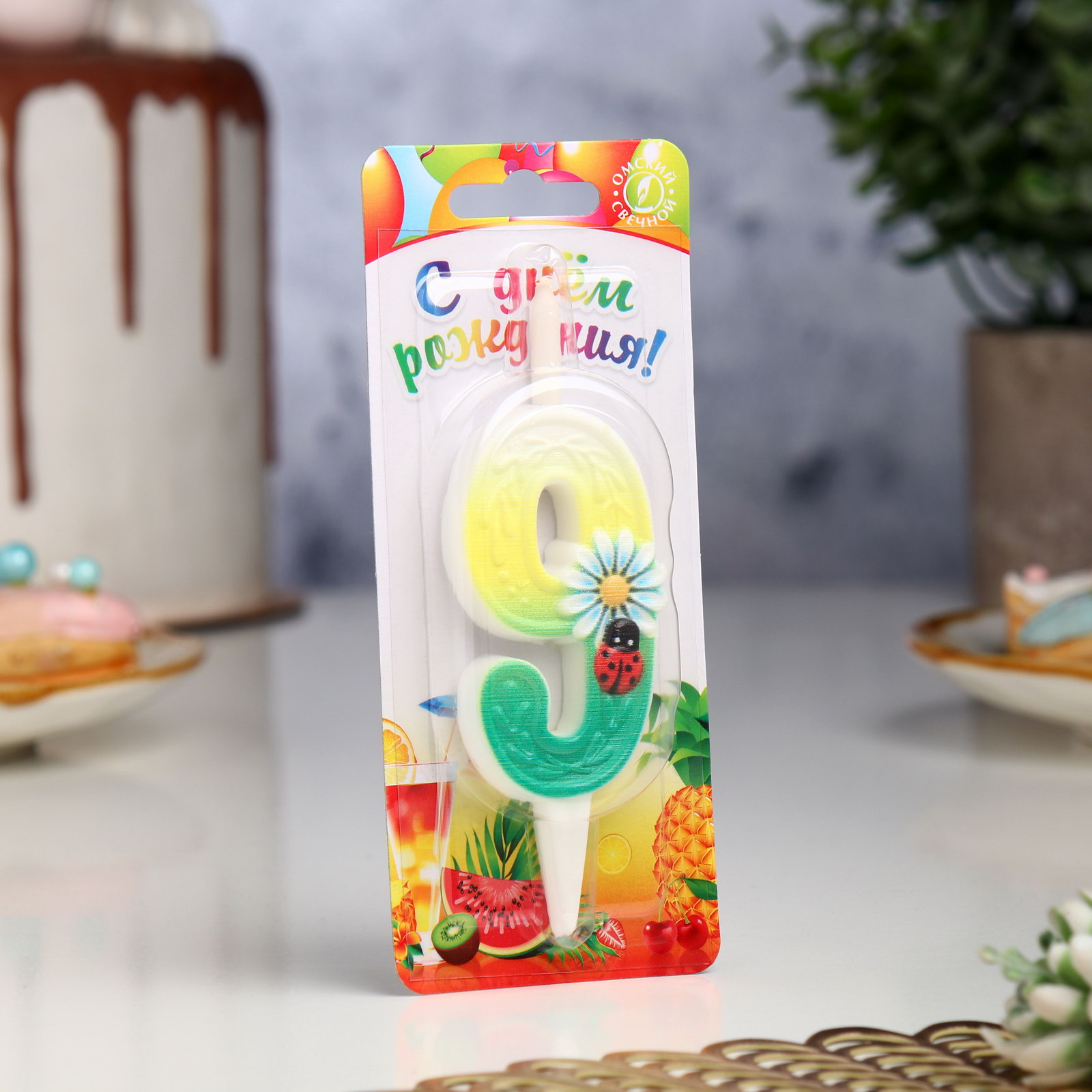 Свеча для торта "Ромашки", 10.2 см, разноцветная цифра 9, Омский свечной завод, Россия