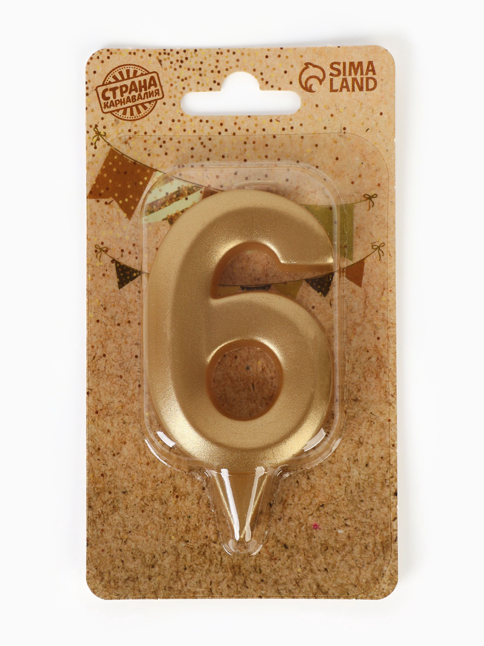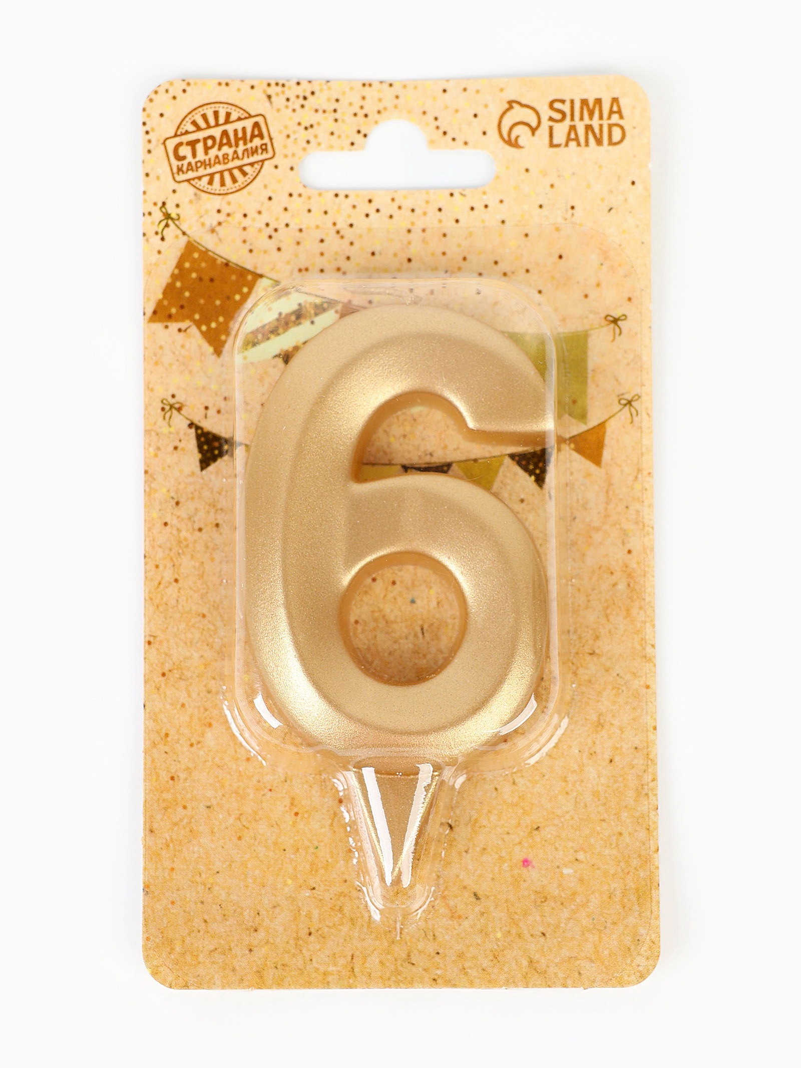 Свеча в торт "Цифра 6", золотая, 6.5 см, Страна Карнавалия, Россия