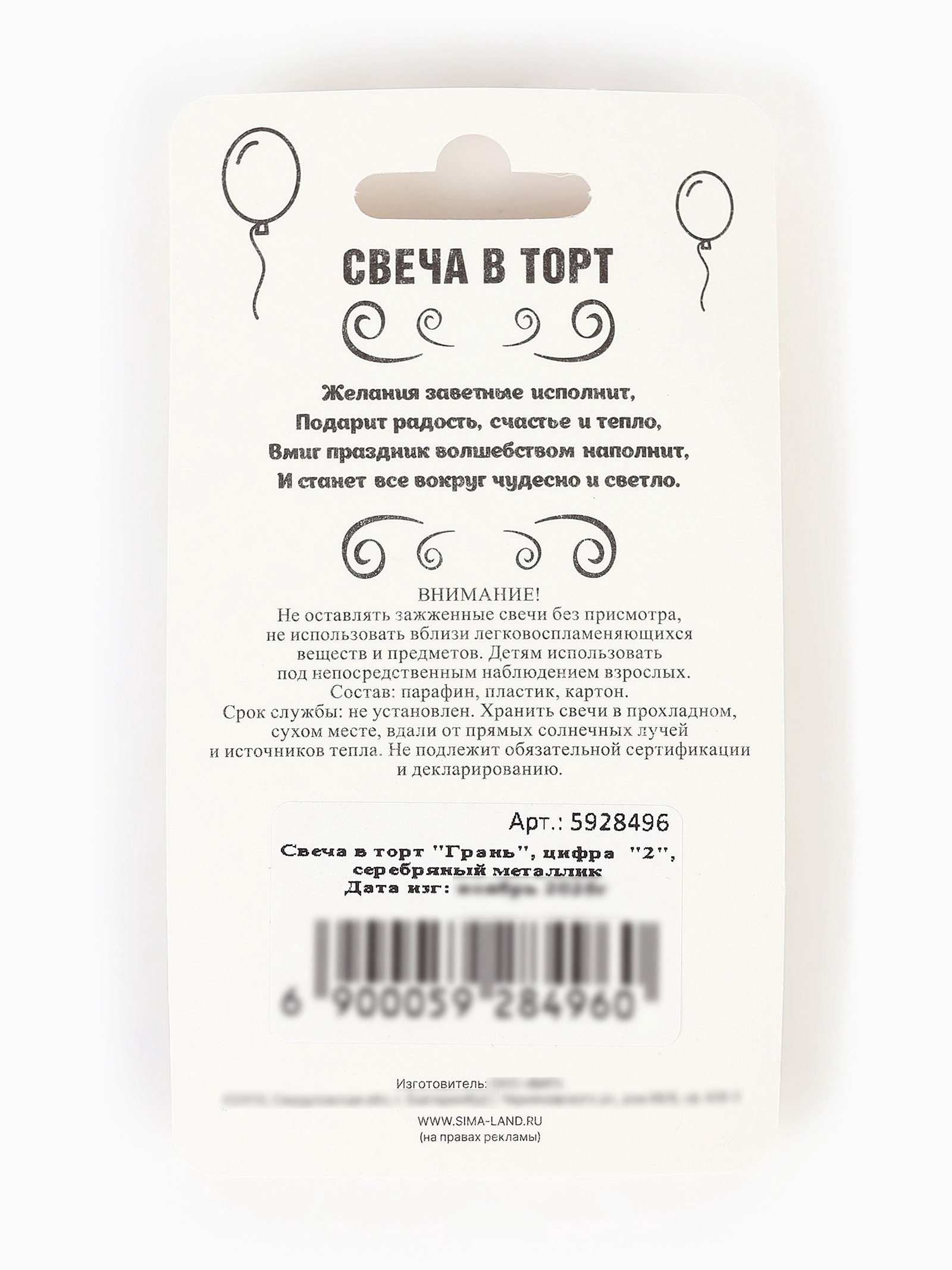 Размер упаковки: 11.5 x 1.2 x 6.4 см. Состав: Парафин Для кого: Унисекс Форма свечи: Цифры В наборе, шт.: 1 tnved: 3406000000 Набор: Нет Температурное ограничение: Нет Цифра: 2 Высота свечи, см: 7.8 Цвет: Серебристый Высота свечи без шпажки, см: 6.5 Уважаемые клиенты! В связи с наступлением осенне-зимнего периода напоминаем Вам, что на свечах с лаковым покрытием от резких перепадов температур или при низкой температуре (ниже – 20С) может отслоиться (вздуться) лак. Явление носит, как правило, обратимый характер. При транспортировке в зимнее (холодное) время года коробки со свечами вскрывать после того, как они постоят на Вашем теплом складе не менее суток. Свечи-цифры – это отличный способ подчеркнуть важную дату или годовщину значимого события: день рождения, годовщина со дня бракосочетания, юбилей кота, празднование по поводу нескольких лет со дня основания фирмы. Свечи подойдут для торта, пирога, капкейка, мороженого или любого другого десерта. Создавайте свой уникальный декор. Комбинируйте цифры, сочетайте между собой различные стилистические решения. | ||
