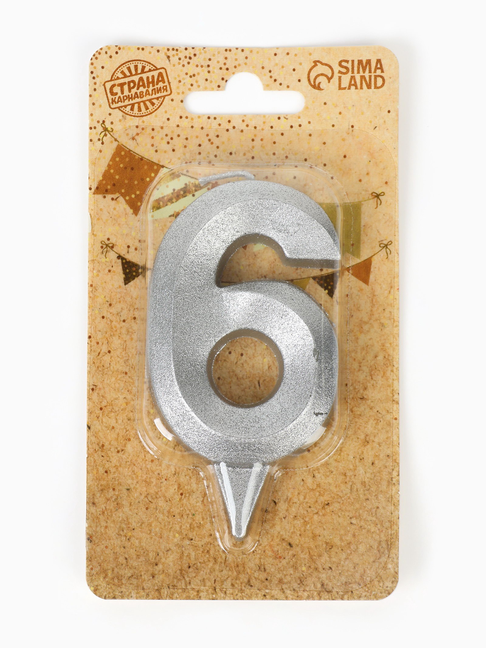Свеча в торт "Цифра 6", серебряная, 6.5 см, Страна Карнавалия, Россия