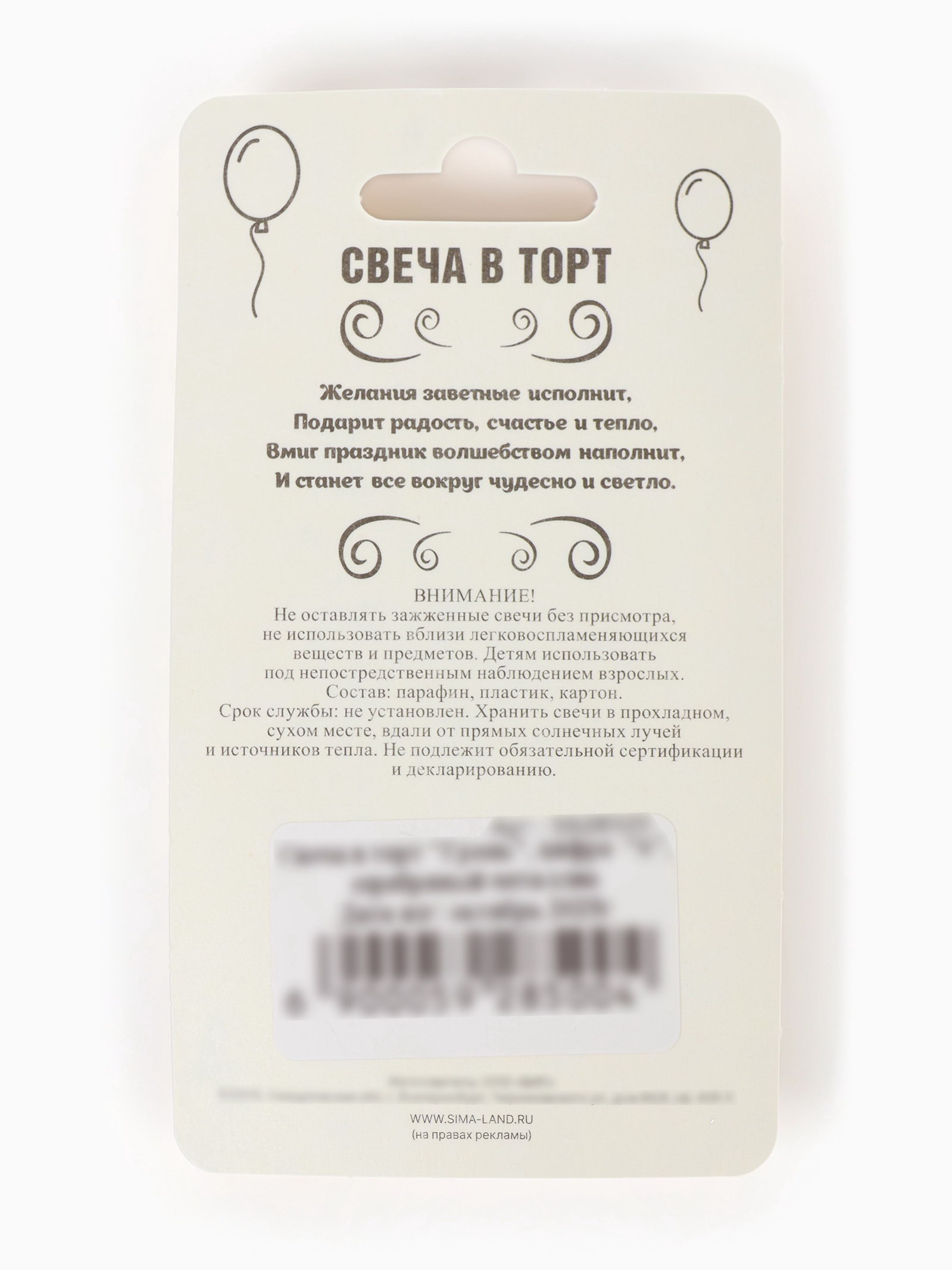 Размер упаковки: 6.5 x 1.2 x 11.5 см. Состав: Парафин Форма свечи: Цифры Для кого: Унисекс В наборе, шт.: 1 tnved: 3406000000 Набор: Нет Температурное ограничение: Нет Цифра: 6 Высота свечи, см: 7.8 Цвет: Серебристый Высота свечи без шпажки, см: 6.5 Уважаемые клиенты! В связи с наступлением осенне-зимнего периода напоминаем Вам, что на свечах с лаковым покрытием от резких перепадов температур или при низкой температуре (ниже – 20С) может отслоиться (вздуться) лак. Явление носит, как правило, обратимый характер. При транспортировке в зимнее (холодное) время года коробки со свечами вскрывать после того, как они постоят на Вашем теплом складе не менее суток. Свечи-цифры – это отличный способ подчеркнуть важную дату или годовщину значимого события: день рождения, годовщина со дня бракосочетания, юбилей кота, празднование по поводу нескольких лет со дня основания фирмы. Свечи подойдут для торта, пирога, капкейка, мороженого или любого другого десерта. Создавайте свой уникальный декор. Комбинируйте цифры, сочетайте между собой различные стилистические решения. | ||