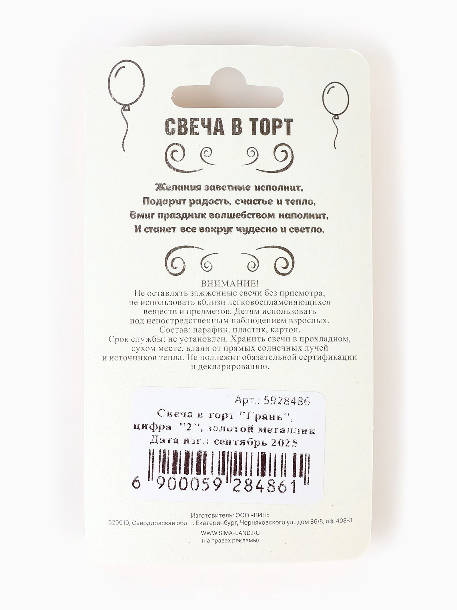 Размер упаковки: 14.5 x 1.2 x 7.5 см. Состав: Парафин Для кого: Унисекс Форма свечи: Цифры В наборе, шт.: 1 tnved: 3406000000 Набор: Нет Температурное ограничение: Нет Цифра: 2 Высота свечи, см: 7.8 Цвет: Золотистый Высота свечи без шпажки, см: 6.5 Уважаемые клиенты! В связи с наступлением осенне-зимнего периода напоминаем Вам, что на свечах с лаковым покрытием от резких перепадов температур или при низкой температуре (ниже – 20С) может отслоиться (вздуться) лак. Явление носит, как правило, обратимый характер. При транспортировке в зимнее (холодное) время года коробки со свечами вскрывать после того, как они постоят на Вашем теплом складе не менее суток. Важно! В настоящее время в продажу поступают два вида свечей. Второй вариант имеет более сглаженные рёбра, во избежание образования сколов при транспортировке. Сама форма свечи осталась без изменений. Несколько праздников – одно решение. Свечи-цифры – это отличный способ подчеркнуть важную дату или годовщину значимого события: день рождения, годовщина со дня бракосочетания, юбилей кота, празднование по поводу нескольких лет со дня основания фирмы. Свечи подойдут для торта, пирога, капкейка, мороженого или любого другого десерта. Создавайте свой уникальный декор. Комбинируйте цифры, сочетайте между собой различные стилистические решения. | ||