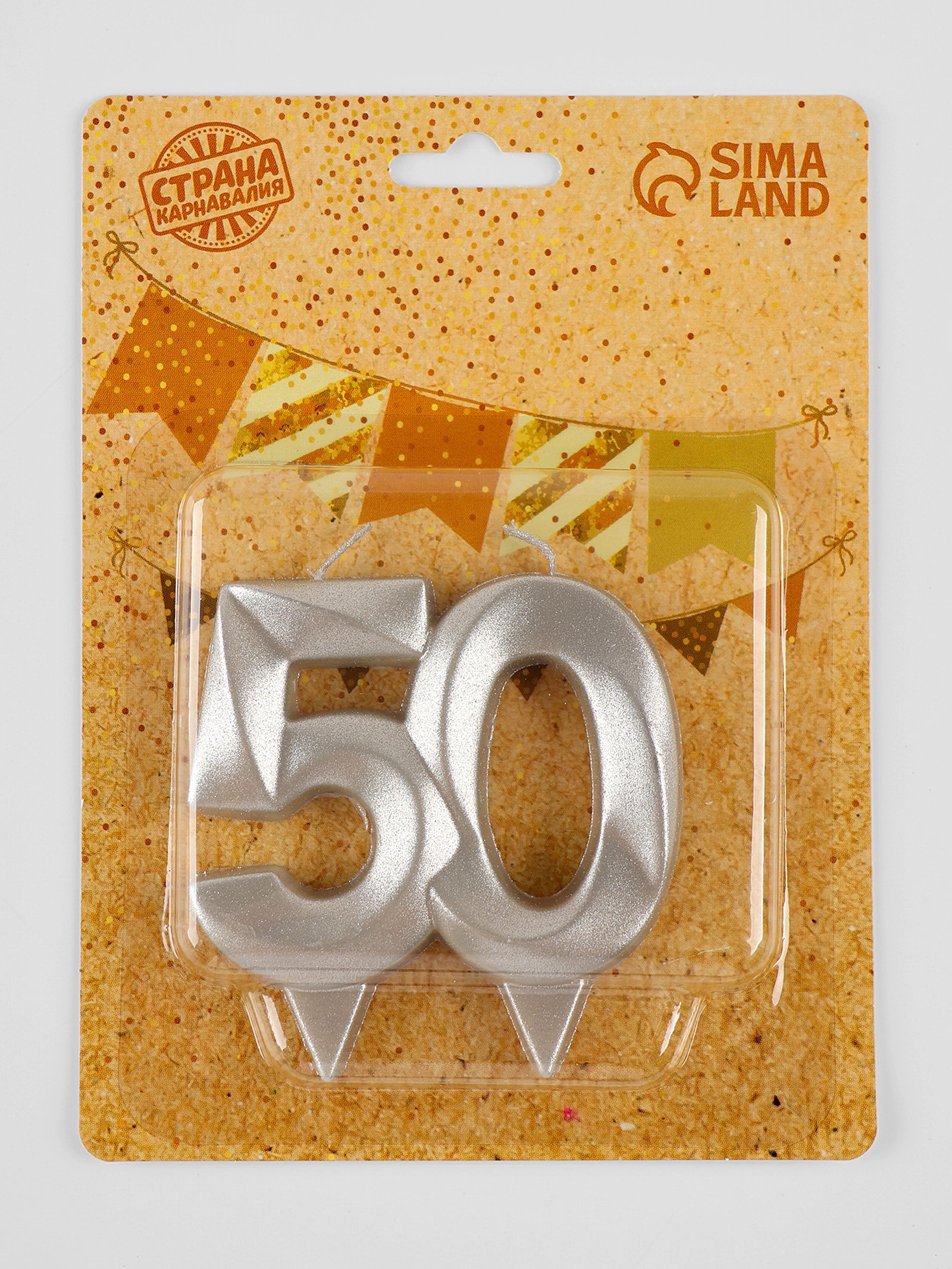 Свеча в торт юбилейная "Грань", цифра 50, серебряный металлик, 6.5 см, Страна Карнавалия, Россия