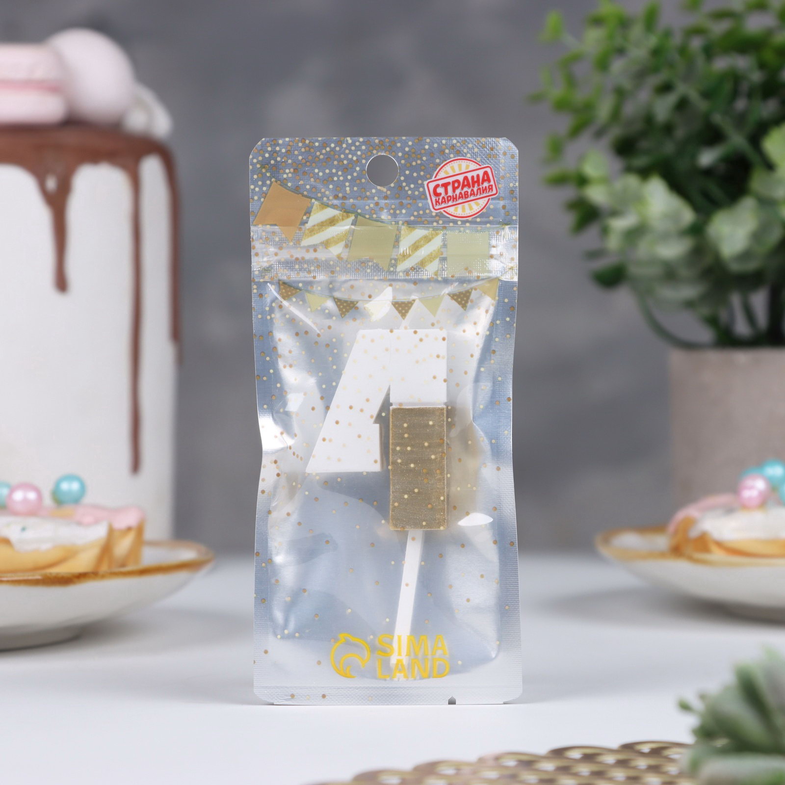 Свеча в торт "Манхеттен", цифра 4, белая с золотом, 5 см, Страна Карнавалия, Китай