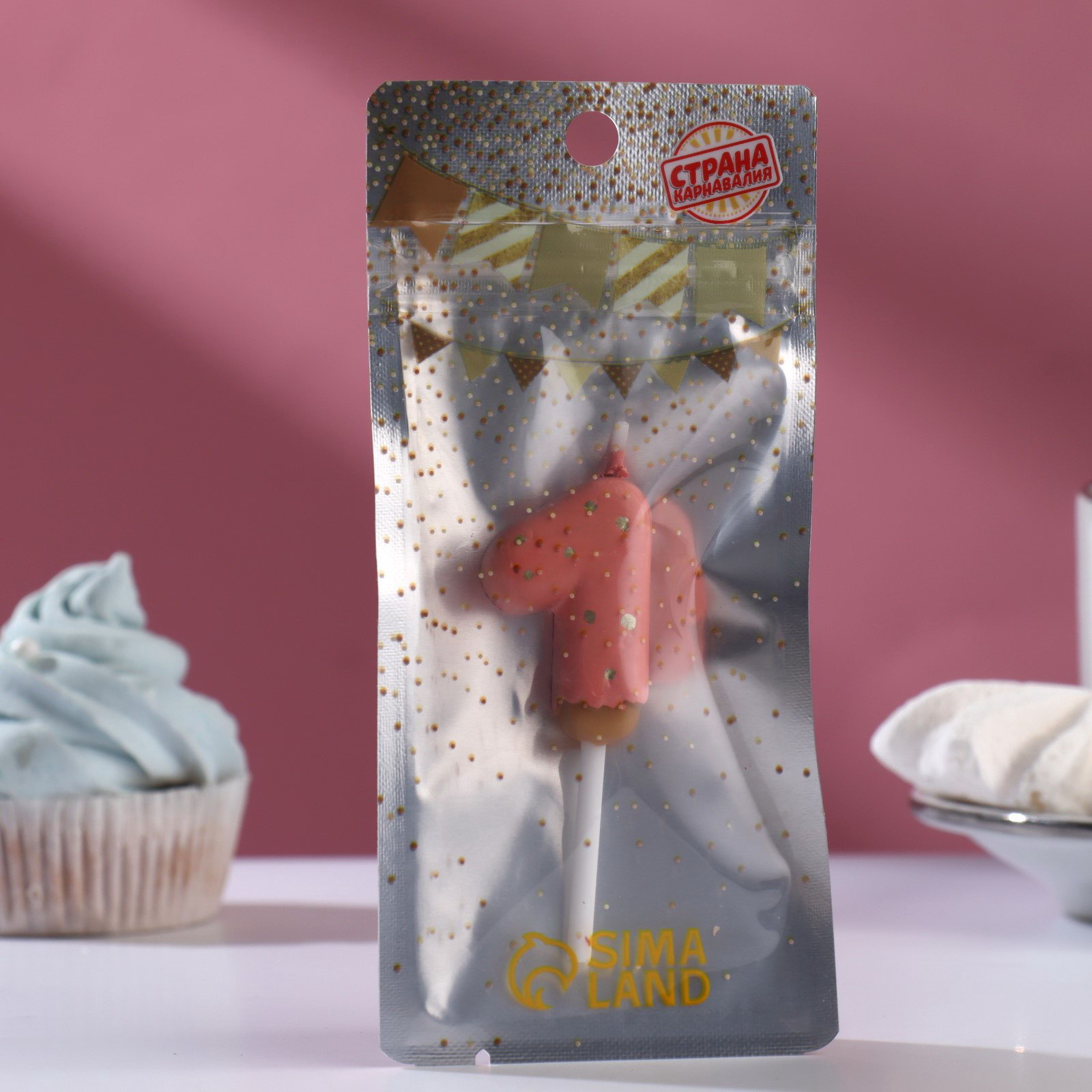 Свеча в торт "Клубничная глазурь", цифра 1, розовая, 3.8 см, Страна Карнавалия, Китай