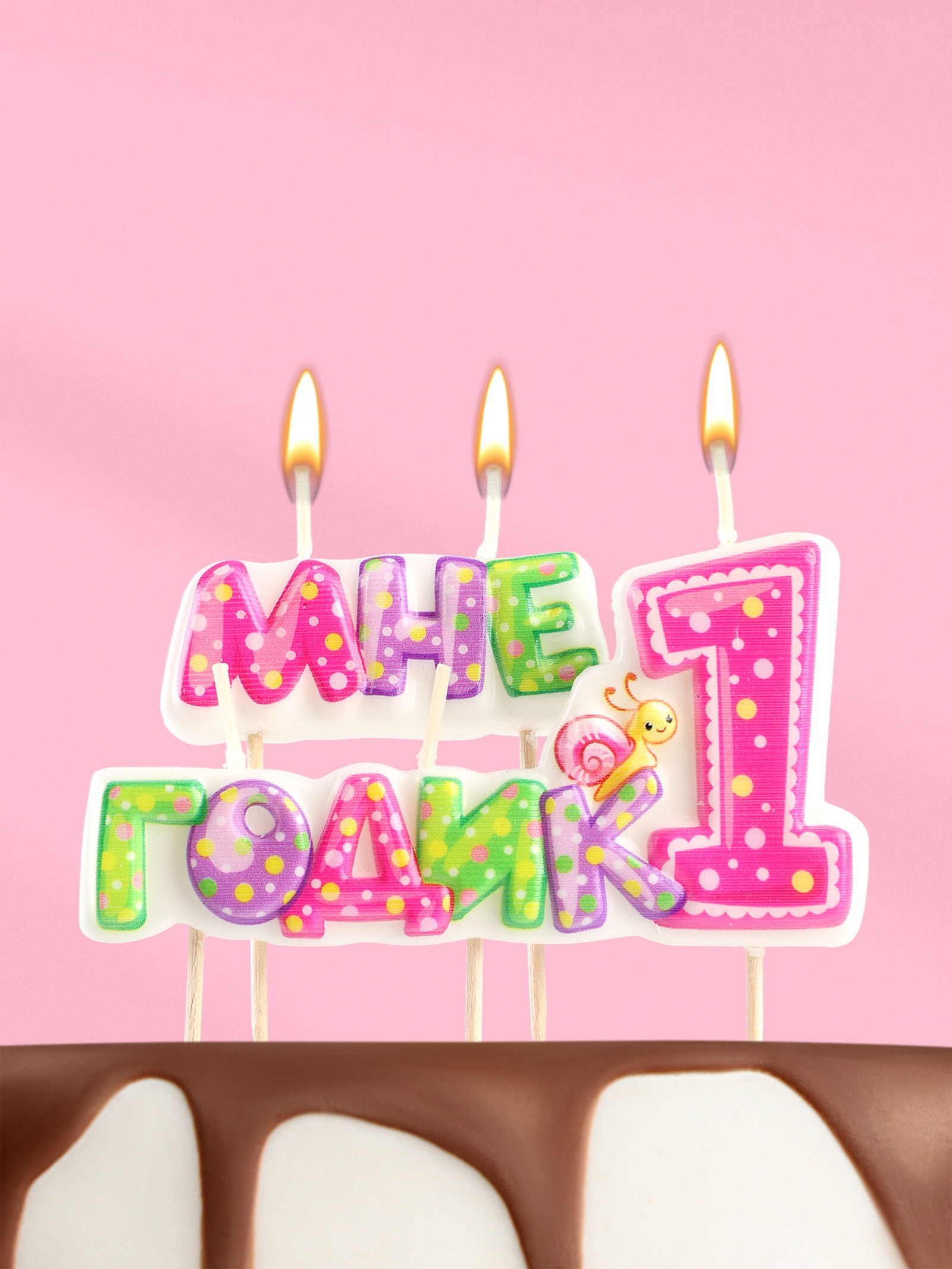 Свеча в торт на шпажке для девочек "Мне годик", 7.7 см, 12 мин, 65 г, Омский свечной завод, Россия