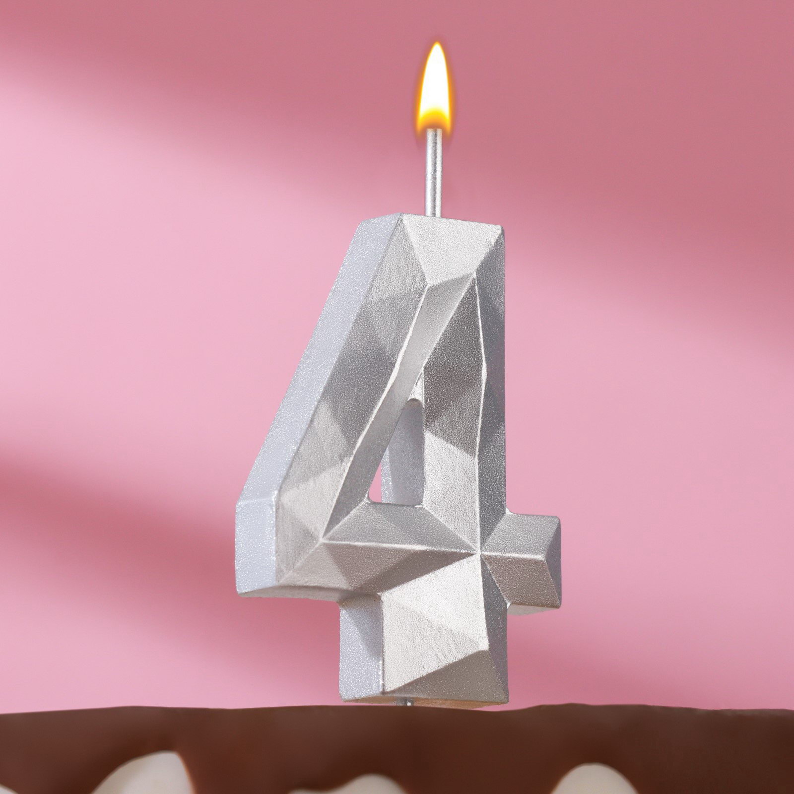Свеча в торт на шпажке "Многогранник", цифра 4, 7 см, серебро, Омский свечной завод, Россия