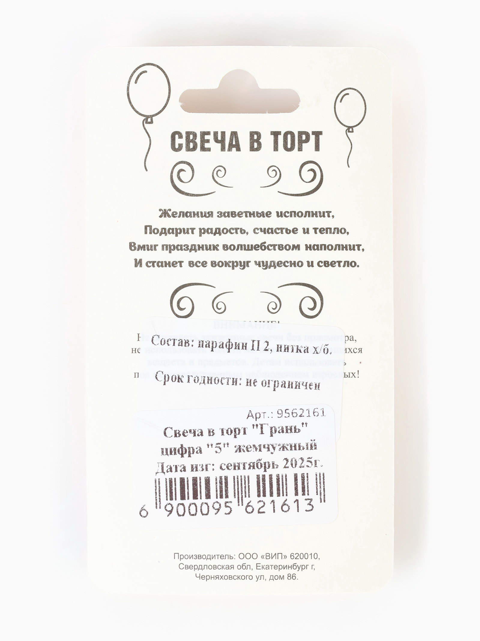 Размер упаковки: 7.5 x 1 x 14.5 см. Состав: Парафин Форма свечи: Цифры Для кого: Унисекс В наборе, шт.: 1 tnved: 3406000000 Температурное ограничение: Нет Цвет: Белый Цифра: 5 Высота свечи, см: 7.8 Высота свечи без шпажки, см: 6.5 Уважаемые клиенты! В связи с наступлением осенне-зимнего периода напоминаем Вам, что на свечах с лаковым покрытием от резких перепадов температур или при низкой температуре (ниже – 20С) может отслоиться (вздуться) лак. Явление носит, как правило, обратимый характер. При транспортировке в зимнее (холодное) время года коробки со свечами вскрывать после того, как они постоят на Вашем теплом складе не менее суток. | ||