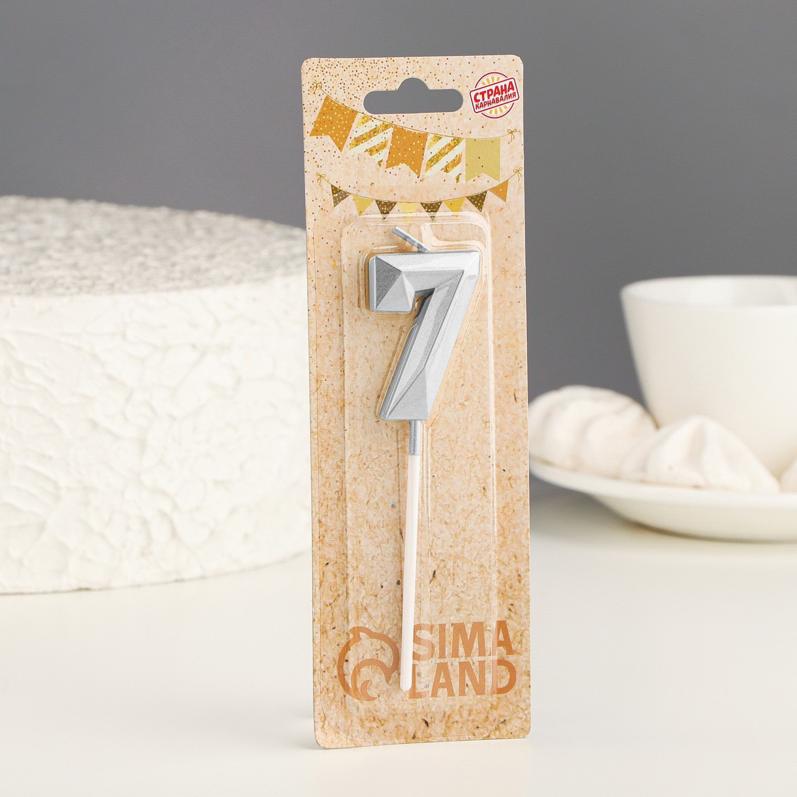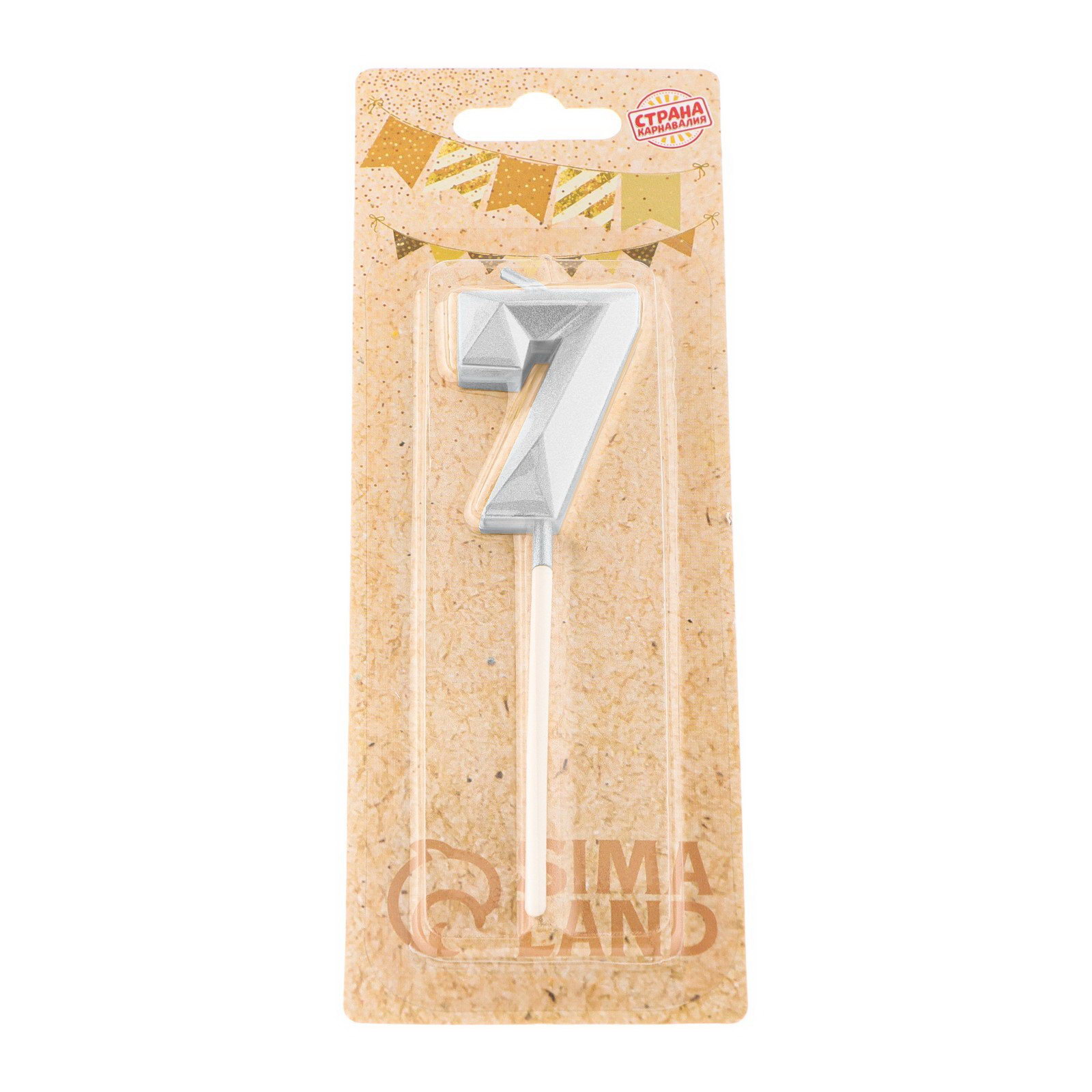 Свеча в торт на шпажке "Алмаз", цифра 7, серебряная, 5x2.6 см, 6x1x18 см., Страна Карнавалия, Китай