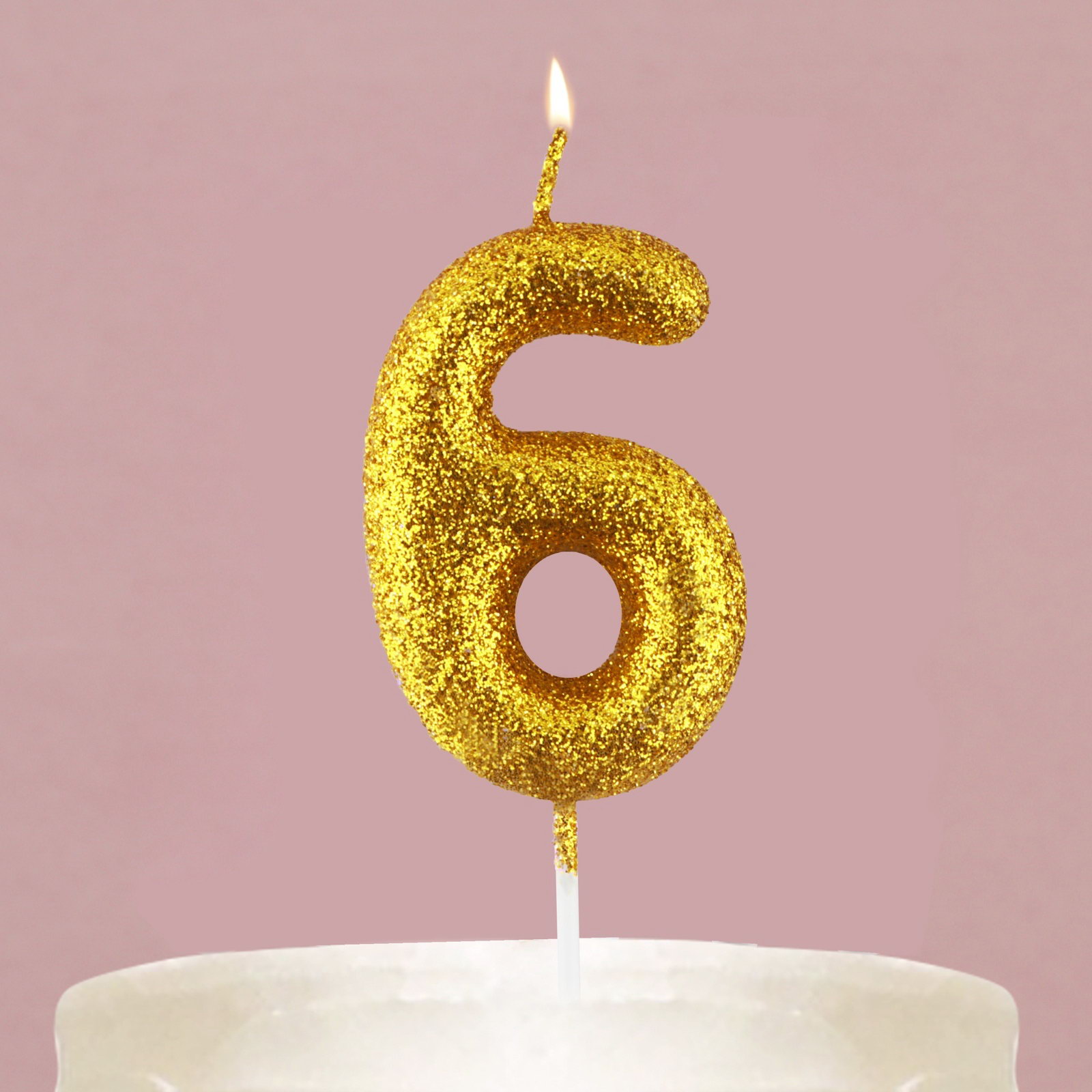 Свеча для торта, цифра, блестящая "6", золото, 9.5 x 4 см, 4x1x10 см., Страна Карнавалия, Китай