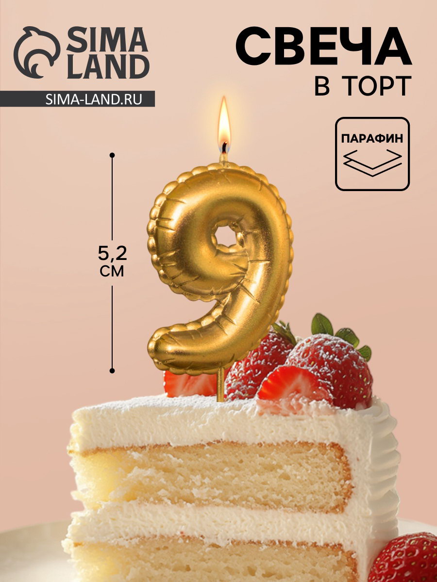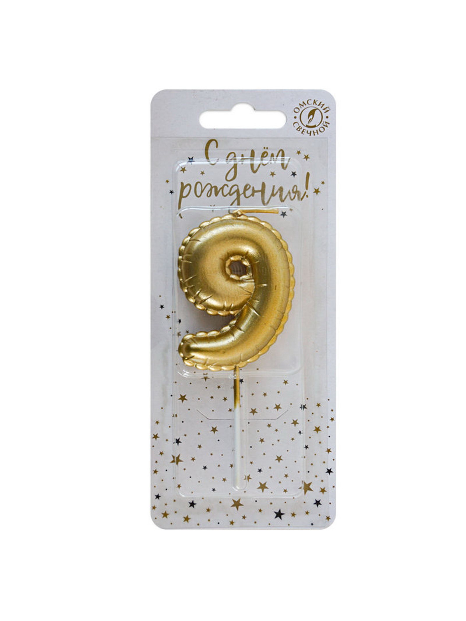 Свеча в торт на шпажке "Воздушная цифра 9", золото, Омский свечной завод, Россия