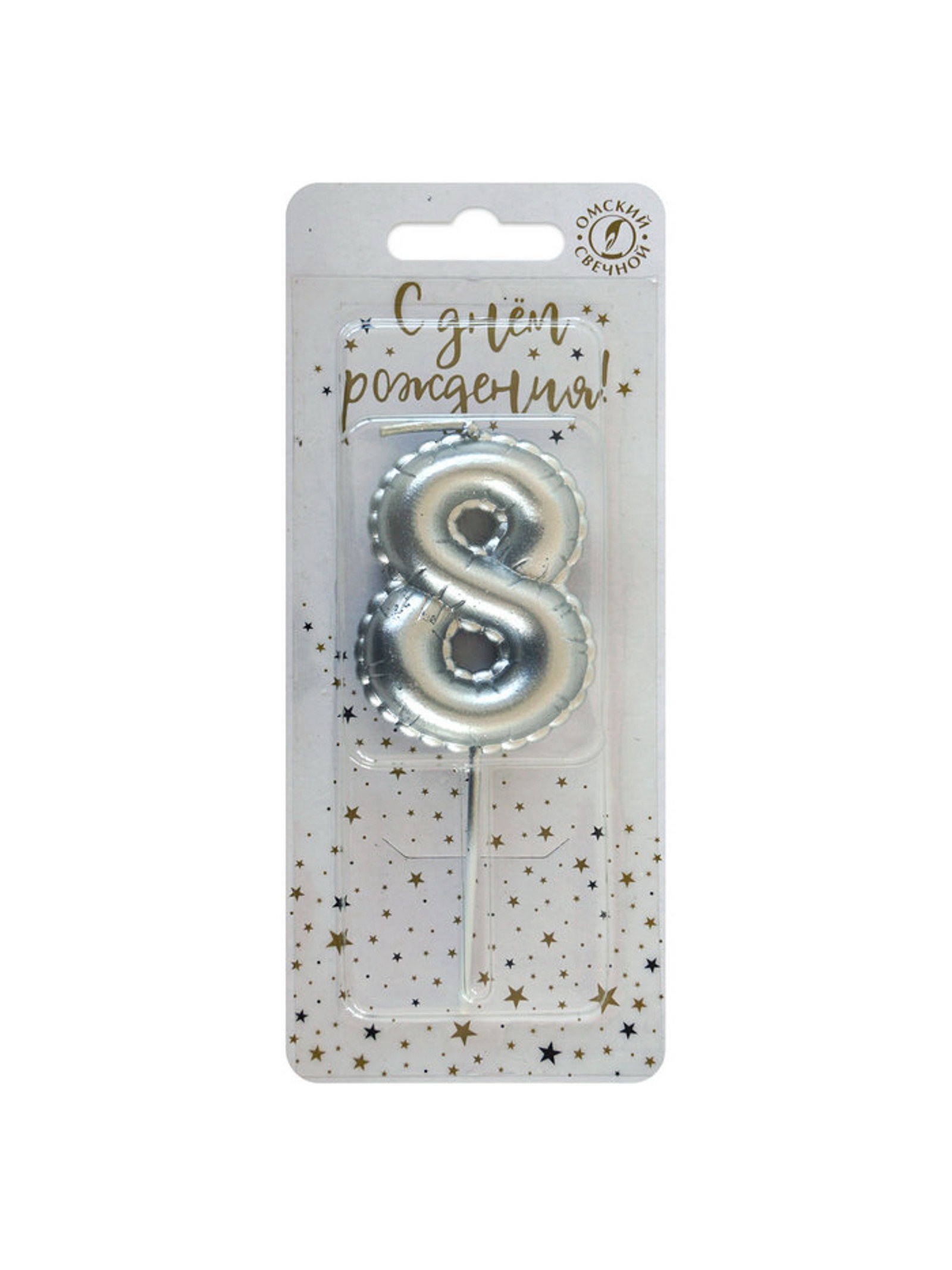 Свеча в торт на шпажке "Воздушная цифра 8", серебро, Омский свечной завод, Россия