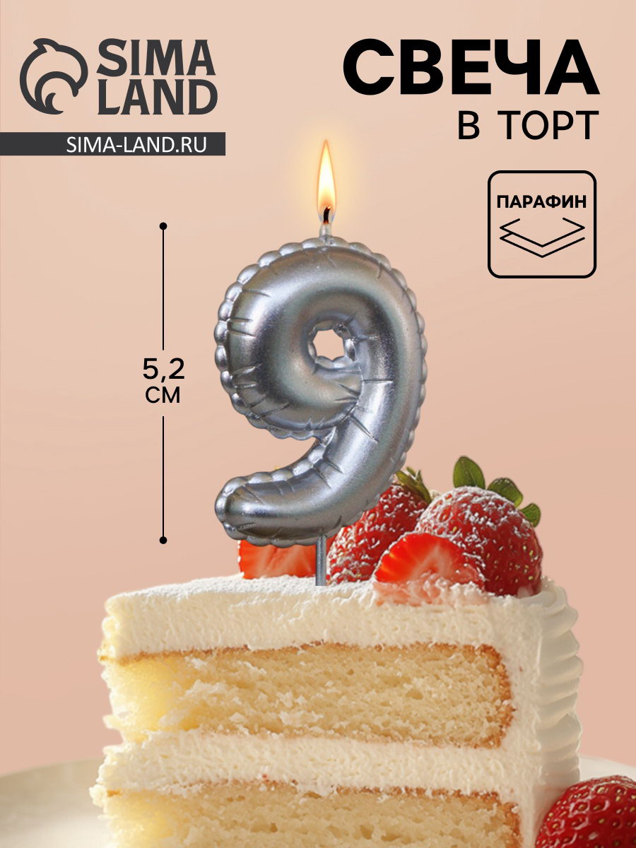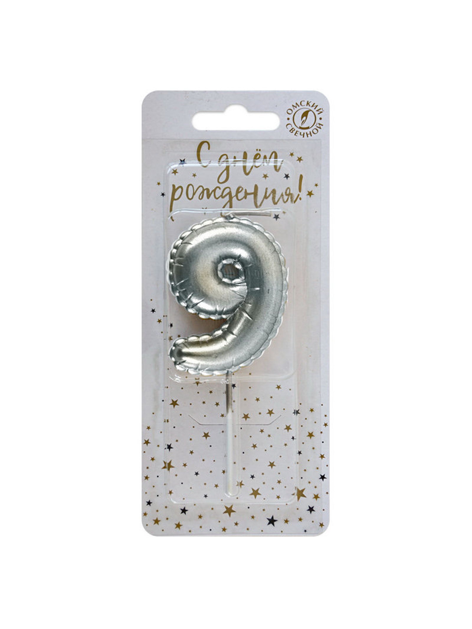 Свеча в торт на шпажке "Воздушная цифра 9", серебро, Омский свечной завод, Россия