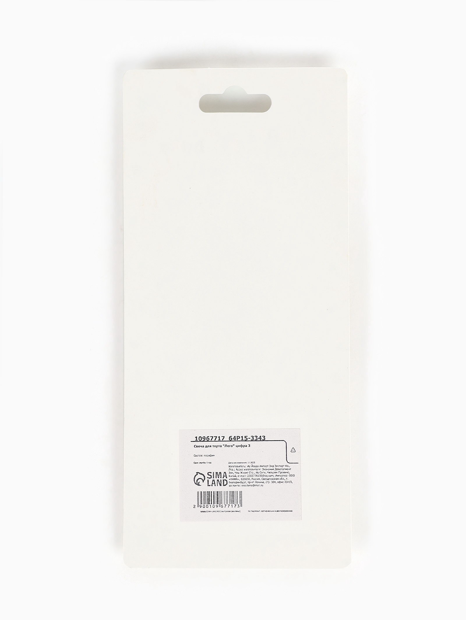 Свеча для торта "Лего" цифра 3, 16.5x7.5x1 см., Китай