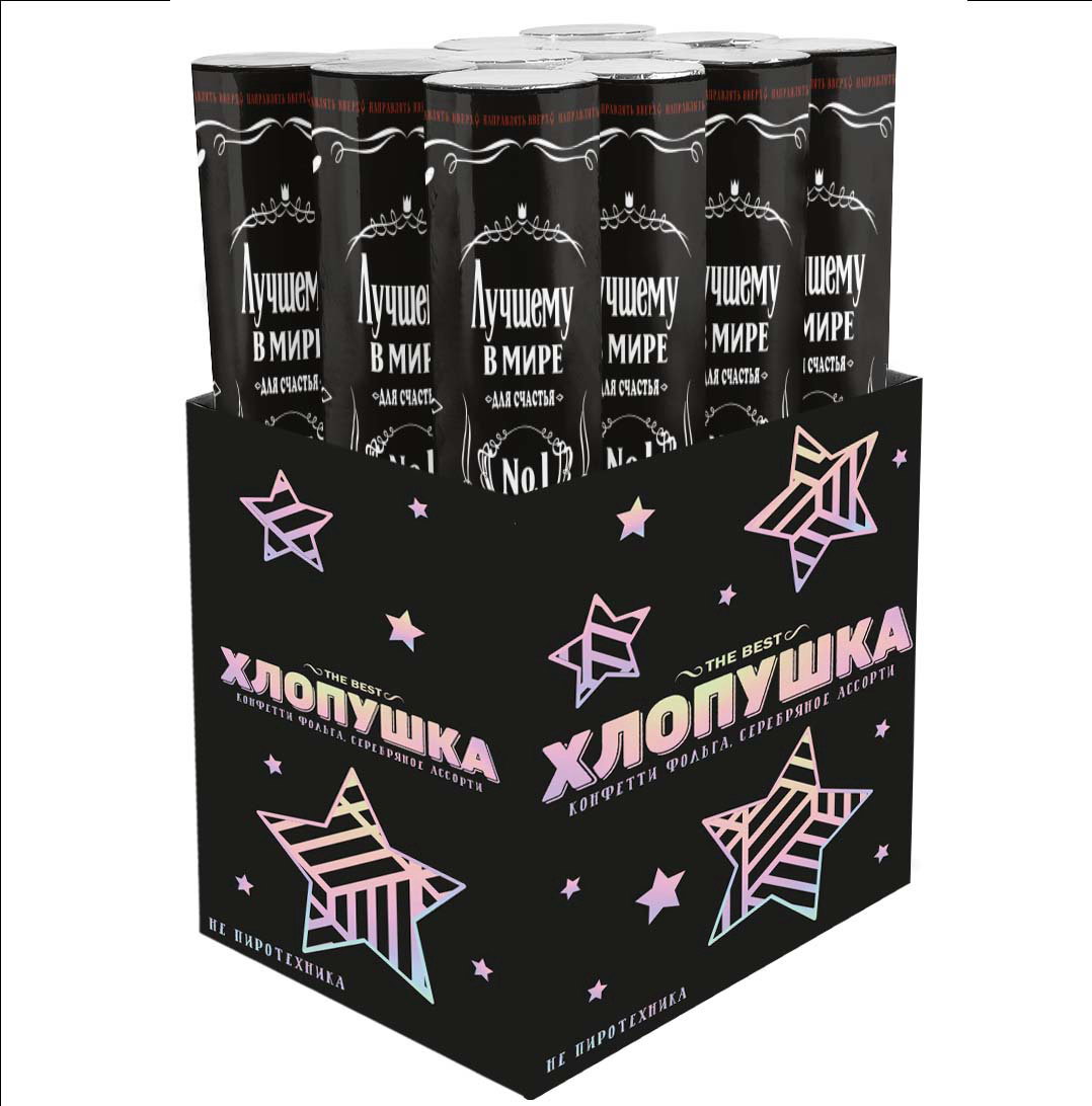 Цвет наполнения: Серебристый, Чёрный Размер упаковки: 5 x 5 x 28 см. tnved: 9505900000 Температурное ограничение: Нет Длина, см: 30 Наполнение: Фольга Вид хлопушки: Пневматическая Тематика хлопушки: Универсальная | ||
