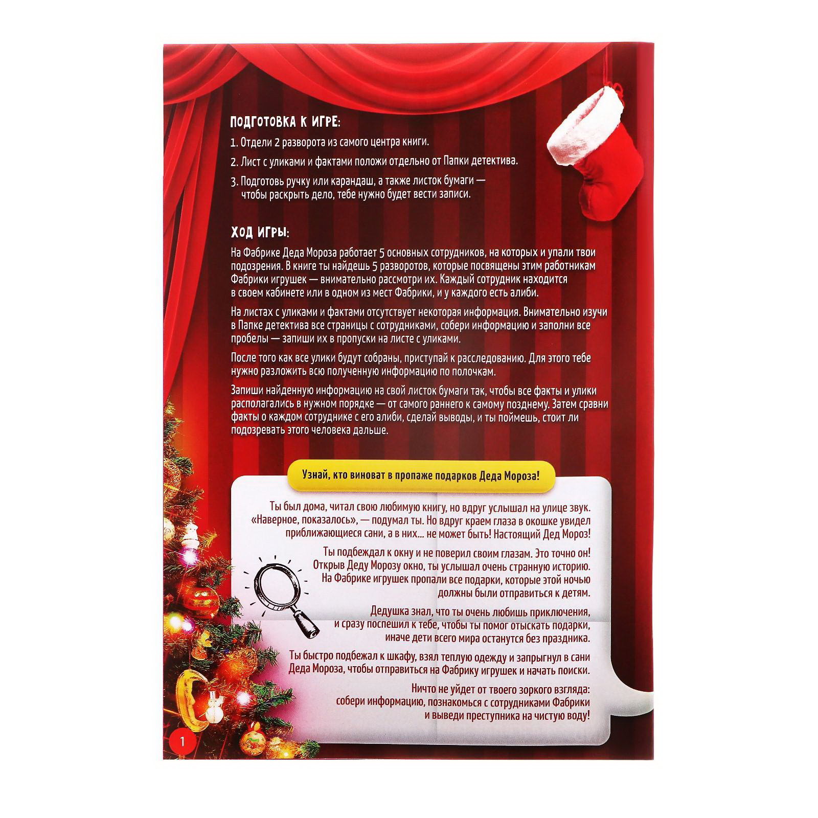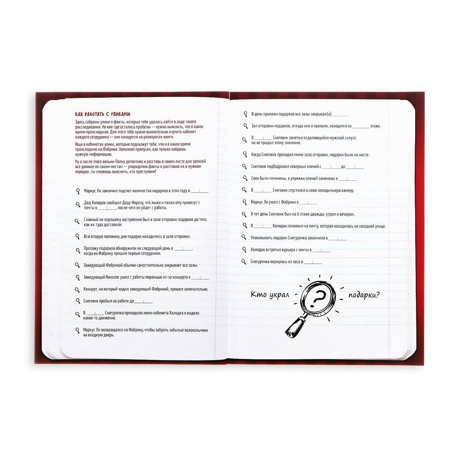 Количество игроков: 1 игрок, 2 - 4 игрока, 2 игрока, 4 - 6 игроков, 6 и более, [1,2] Жанр игры: Детективы, Квесты и психологические, Логическая Возраст: Детский, От 8 лет Развитие навыков: Логика, Сюжетные игры Повод для игры: Детский праздник, Новый год, Праздник, Универсальный Размер упаковки: 15 x 21 x 0.2 см. tnved: 4901990000 tnved: 4901990000 Формат: А5 Вид книги: Квест Язык издания: Русский Тематика праздника: Новый год Количество страниц: 22 Тип обложки: Мягкий переплёт Набор: Нет Год издания: 2021 Время игры: 20 минут Символ года: Нет Авторские настольные игры: Нет Медиагалерея: Видео Возрастная категория: 7+ Вид: Игры Только вы можете спасти праздник!В этой книге вас ждут загадки и приключения. Раскройте тайну пропажи новогодних подарков только от вас зависит, получат ли все дети мира подарки. Отправьтесь на фабрику игрушек Деда Мороза и разоблачите преступников! Что нужно делатьНа фабрике Деда Мороза работает 5 основных сотрудников, на которых и пали подозрения. В книге вы найдёте 5 разворотов, которые посвящены работникам фабрики внимательно рассмотрите их. Каждый сотрудник находится в своём кабинете или в одном из мест на фабрике игрушек, и у каждого есть алиби. На листах с уликами и фактами отсутствует время некоторых событий. Внимательно изучите все страницы, соберите информацию и заполните пробелы во времени. После того как все улики будут собраны, приступайте к расследованию. Для этого вам нужно разложить всю полученную информацию по полочкам. Удачи! Почувствуйте себя настоящим детективом! | ||