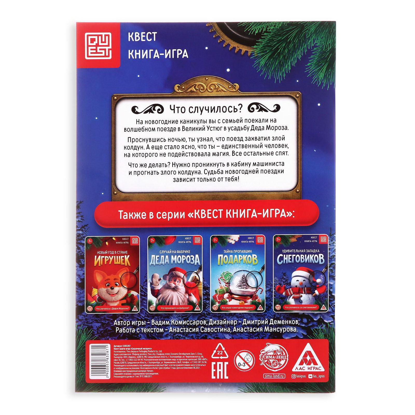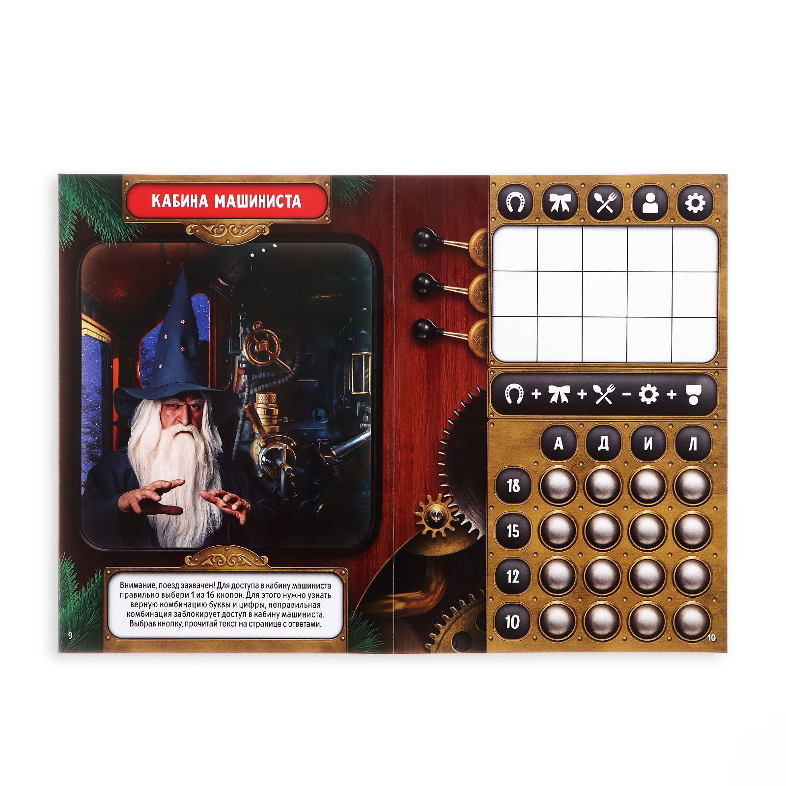 Количество игроков: 1 игрок, [1,2] Возраст: Детский, От 7 лет Развитие навыков: Логика, Сюжетные игры Повод для игры: Детский праздник, Новый год, Праздник, Универсальный Размер упаковки: 15 x 21 x 0.2 см. tnved: 4901990000 tnved: 4901990000 Вид книги: Квест Язык издания: Русский Жанр игры: Квесты и психологические Тематика праздника: Новый год Количество страниц: 18 Авторские настольные игры: Да Тип обложки: Мягкий переплёт Год издания: 2021 Набор: Нет Время игры: 10 минут Символ года: Нет Медиагалерея: Видео Возрастная категория: 7+ Вид: Игры Прокатитесь на сказочном экспрессе! На новогодние каникулы вы с семьёй поехали на волшебном поезде в Великий Устюг в усадьбу Деда Мороза. Проснувшись ночью, вы узнали, что поезд захватил злой колдун. А ещё стало ясно, что вы единственный человек, на которого не подействовала магия. Все остальные спят. Что же делать? Добраться до кабины машиниста, прогнать колдуна и спасти Новый год! Собирайте улики, разгадывайте головоломки и веселитесь! Что нужно делать? Каждый разворот книги это одна из локаций сказочного экспресса. Здесь не имеет значения, с какой именно начинать и в каком порядке проходить локации. Делайте выбор самостоятельно исходя из инструкции по управлению поездом. Внимательно изучайте локации и собирайте улики. Только так можно достичь цели. Записывайте находки на свой листок, чтобы в любой момент можно было свести всё к одному выводу. Шифры, головоломки и увлекательные приключения ждут вас! Встречайте Новый год вместе с ЛАС ИГРАС! | ||