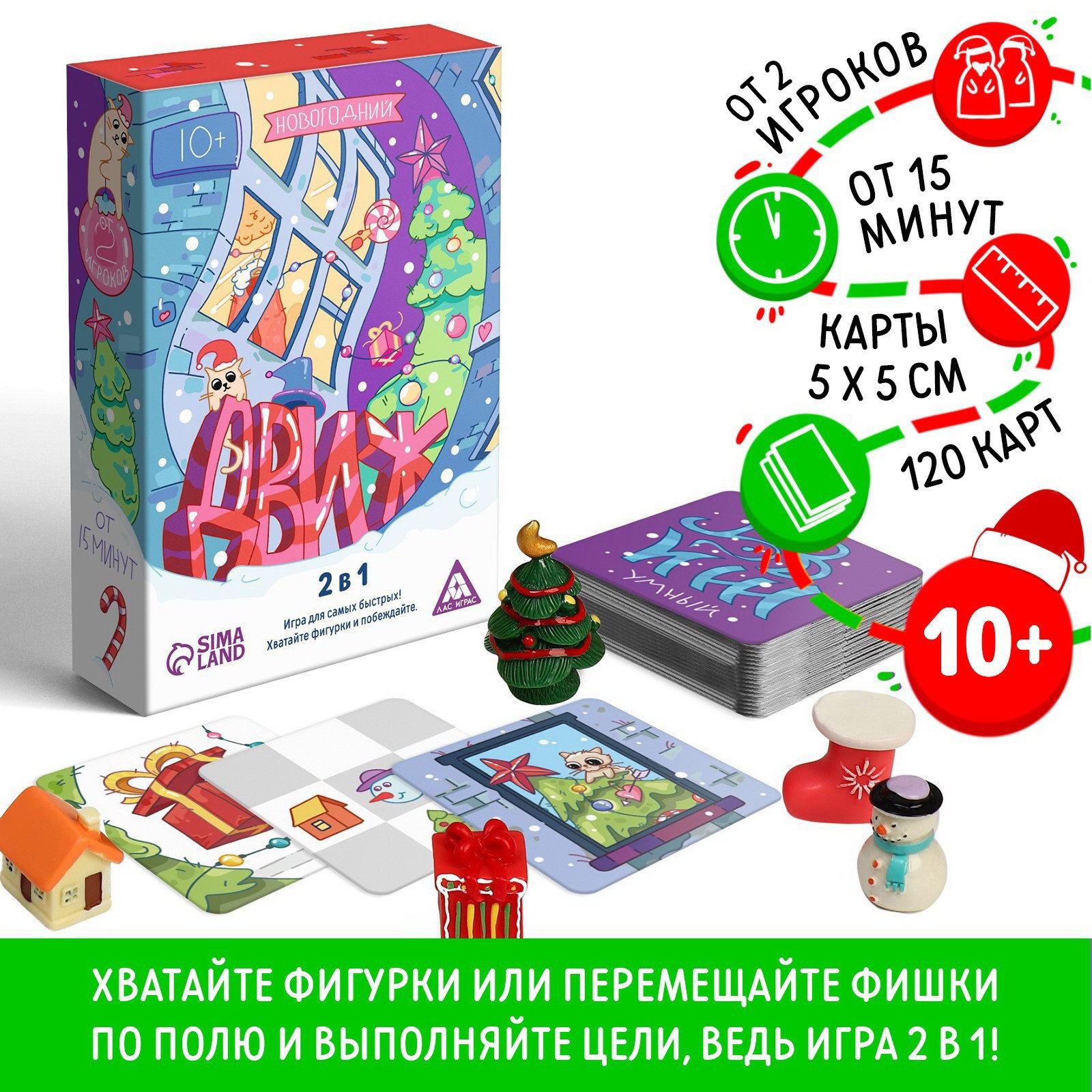 Новогодняя настольная игра "Новый год: ДВИЖ", 2 в 1, 120 карт, 5 фигурок, 10+, 15.5x10.5x3.3 см., ЛАС ИГРАС, Китай