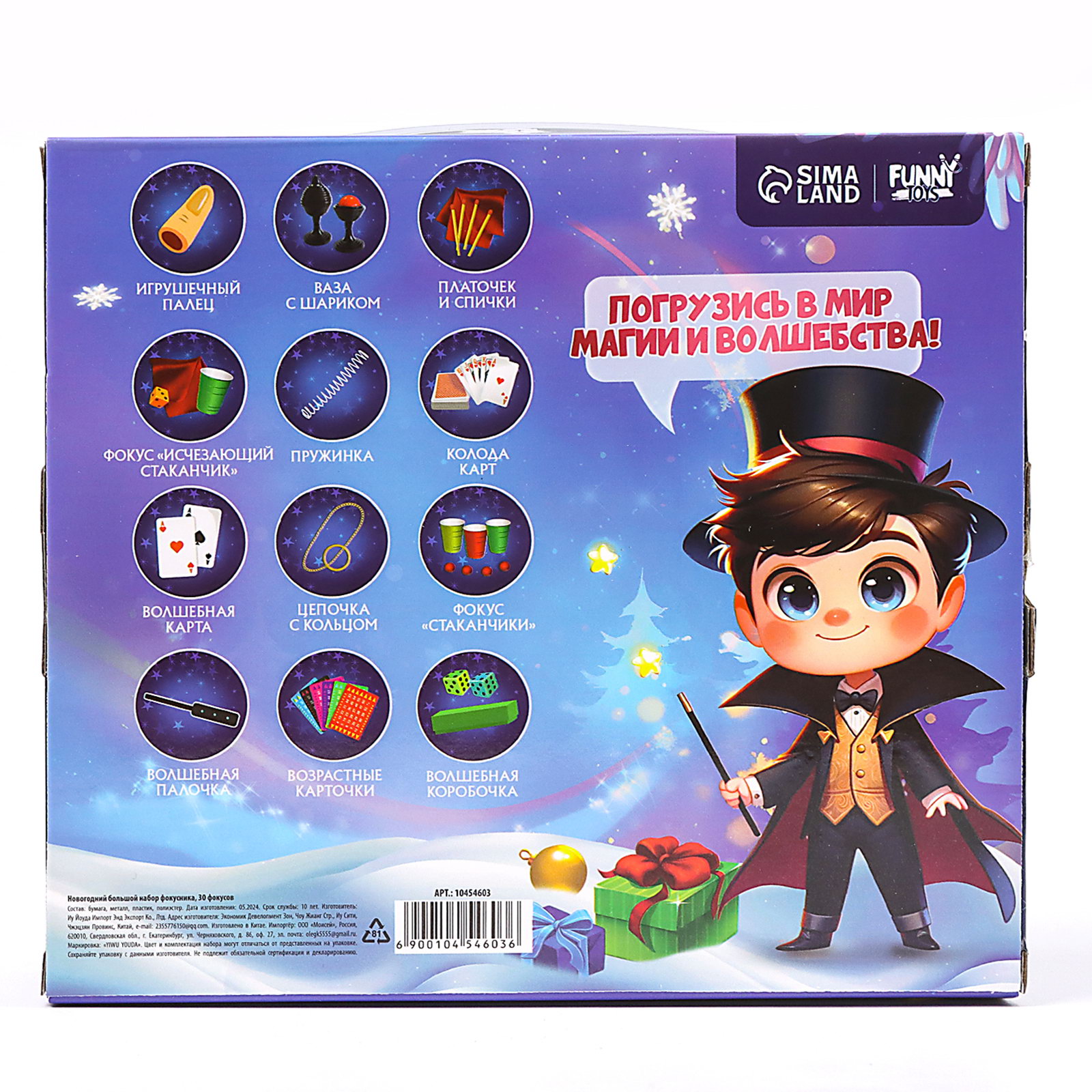 Размер упаковки: 5 x 16 x 18 см. Возраст: От 7 лет tnved: 9505900000 Удиви зрителей волшебными трюками! Большой новогодний набор фокусника это готовый реквизит для начинающего иллюзиониста. С ним ребёнок освоит первые магические номера, разовьёт ловкость рук и уверенность перед публикой. Идеально подходит для домашних выступлений. Особенности