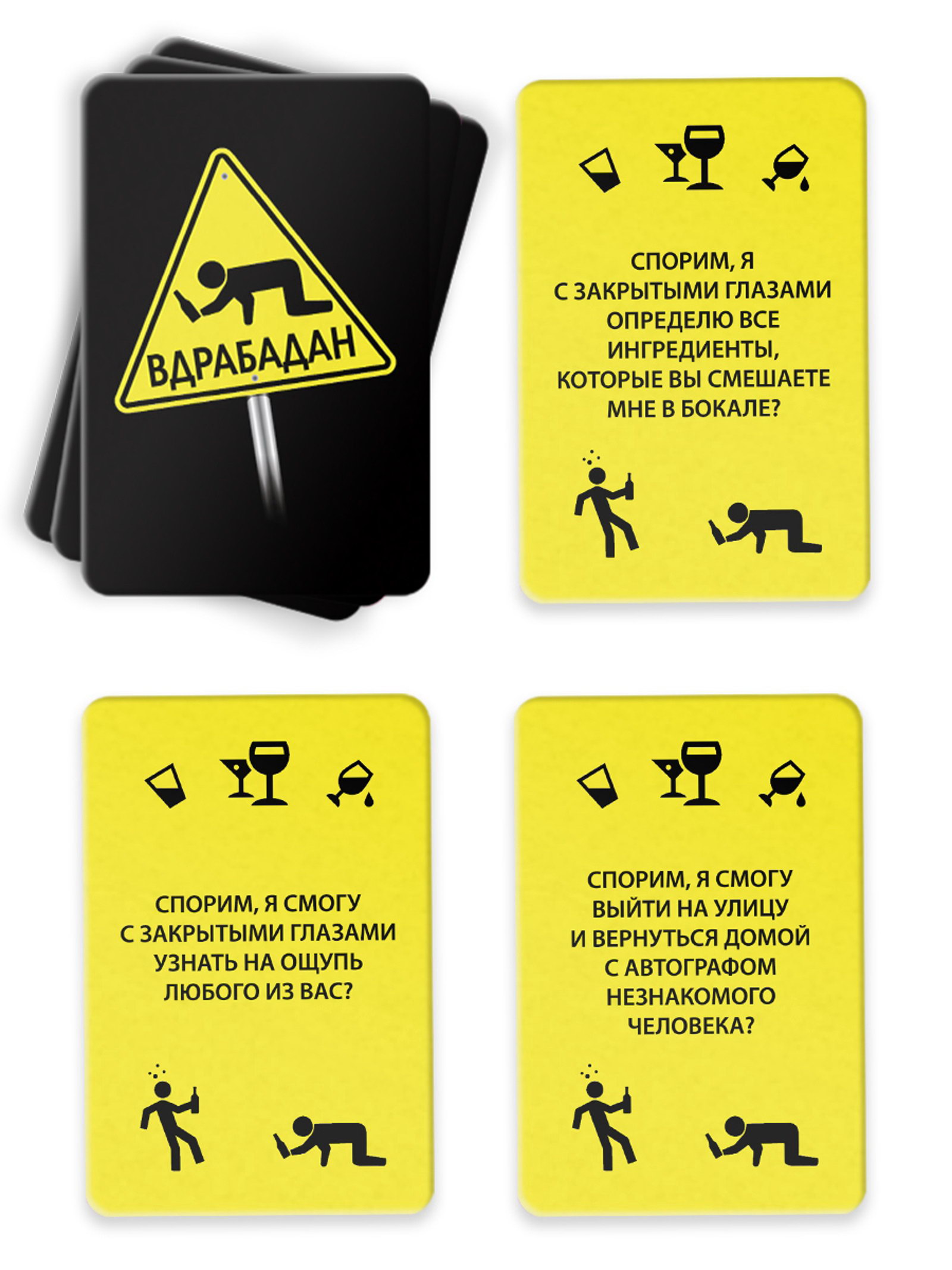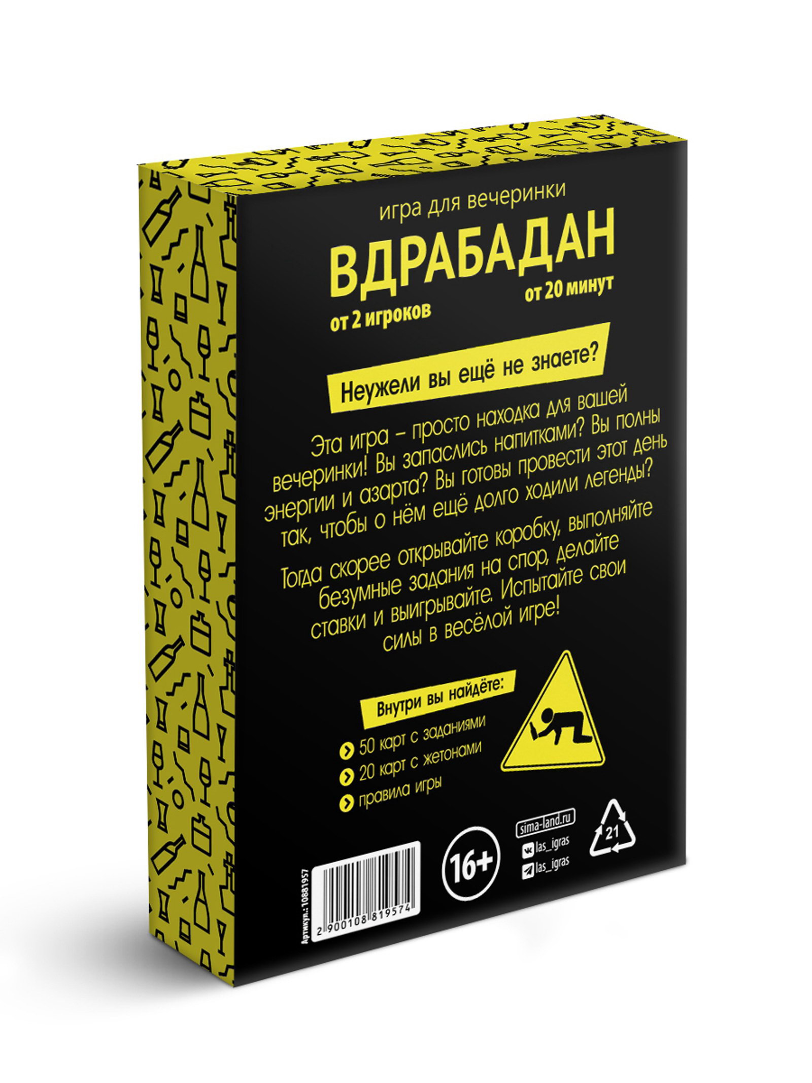Размер упаковки: 9.5 x 12.5 x 3.5 см. tnved: 9504400000 Жанр игры: Коммуникативная Количество игроков: От 2 игроков Намечается вечеринка? Тогда открывайте настольную игру "Вдрабадан", испытывайте свои силы и получайте массу позитива! Состав: